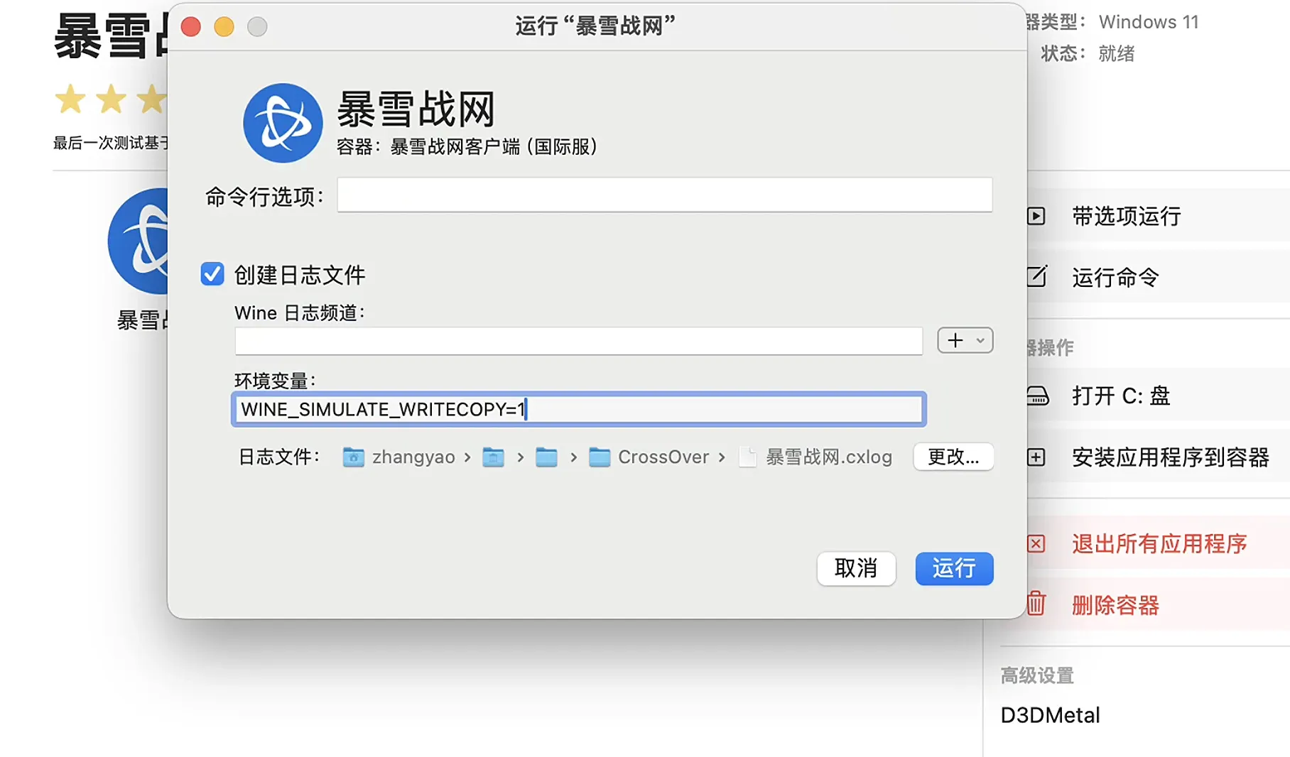 步骤二: 勾选「创建日志文件」,并清空「 Wine 日志频道」,然后在「环境变量」中输入 WINE_SIMULATE_WRITECOPY=1 ,最后点击「运行」: