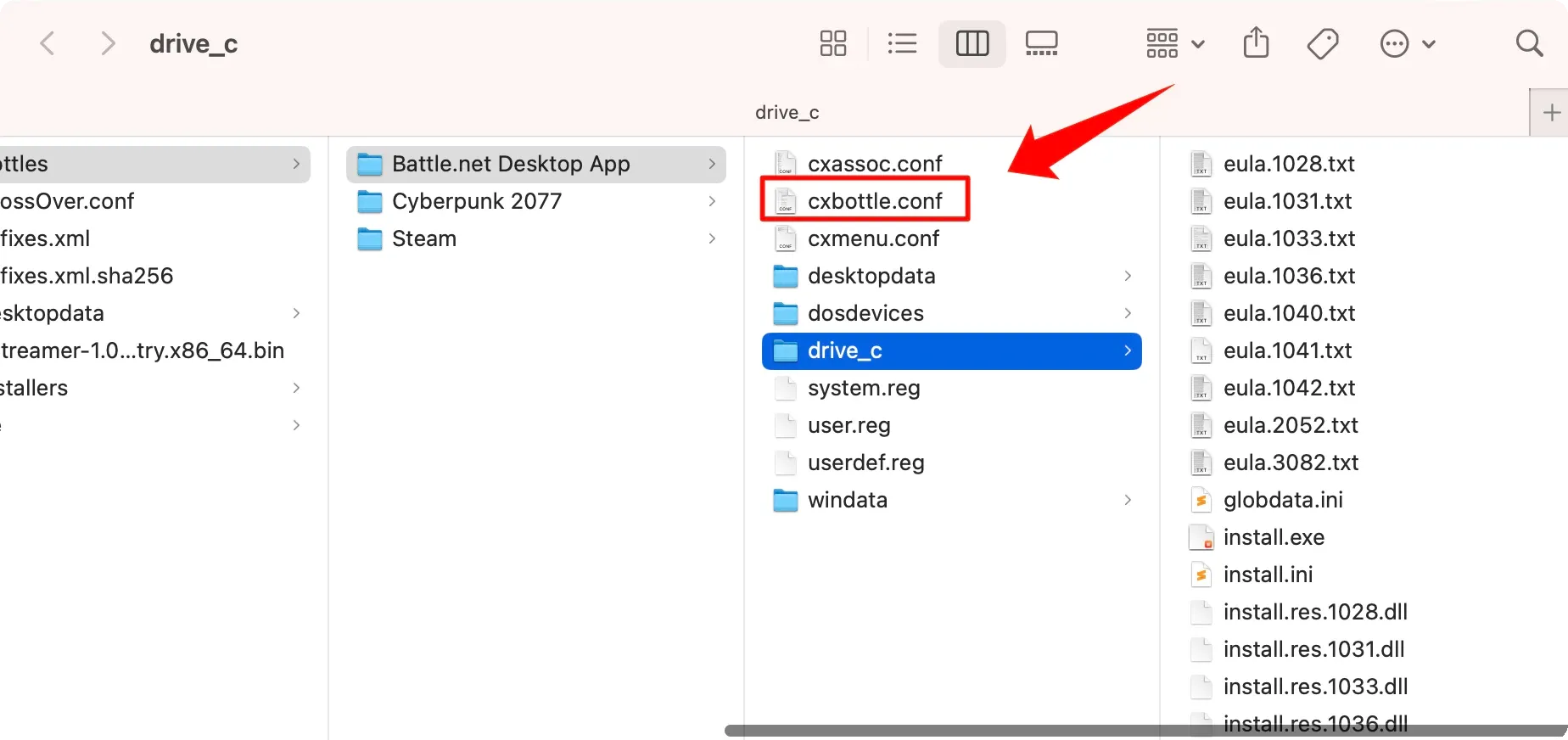 然后在 C 盘的上一级路径,找到 cxbottle.conf 文件,打开它: