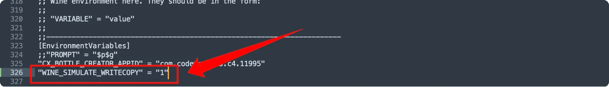 在文件最后(也就是 [EnvironmentVariables] 部分),添加一行「”WINE_SIMULATE_WRITECOPY” = “1”」,然后保存它: