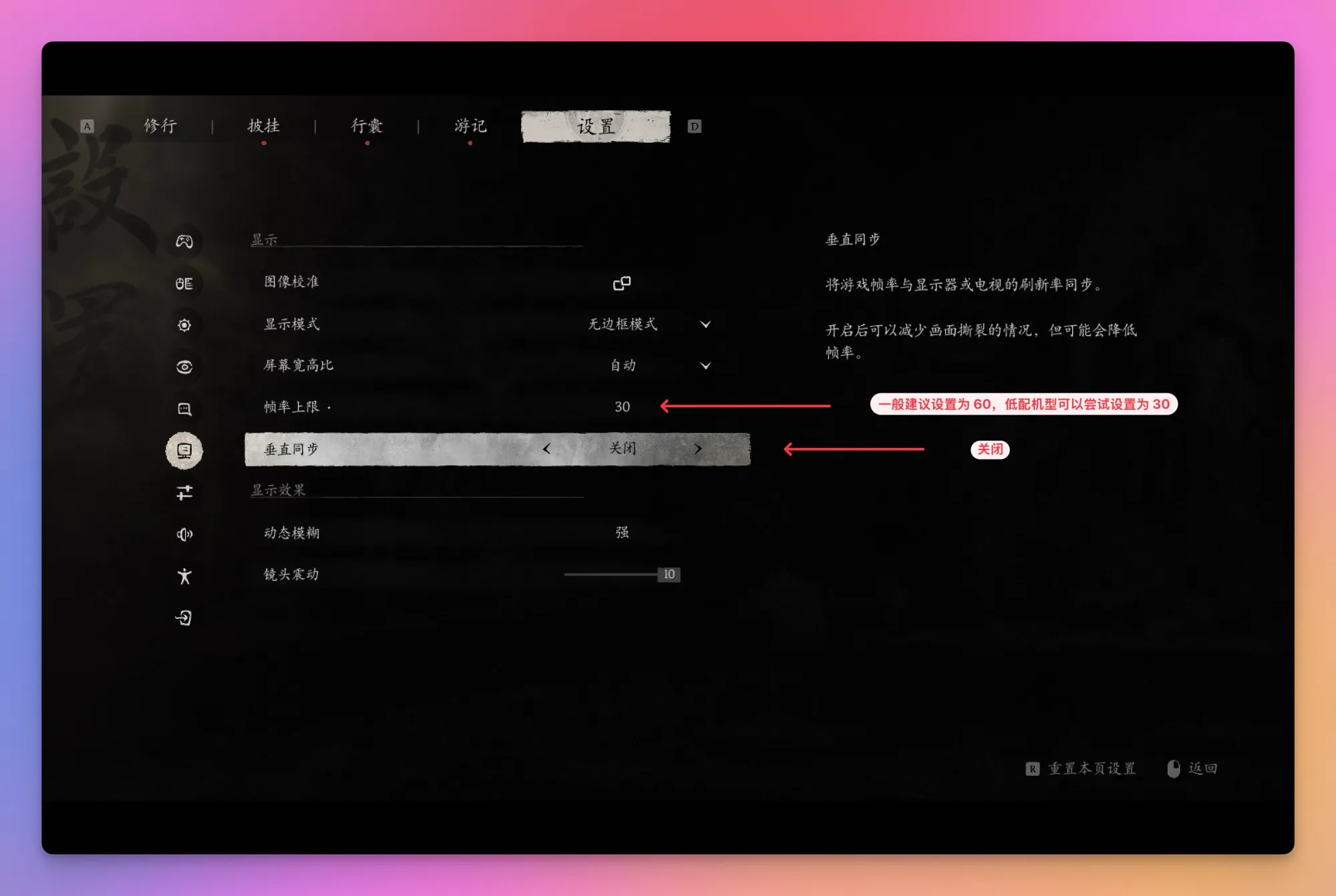 - 【帧率上限】一般建议 60,低配机型尝试设置为 30;