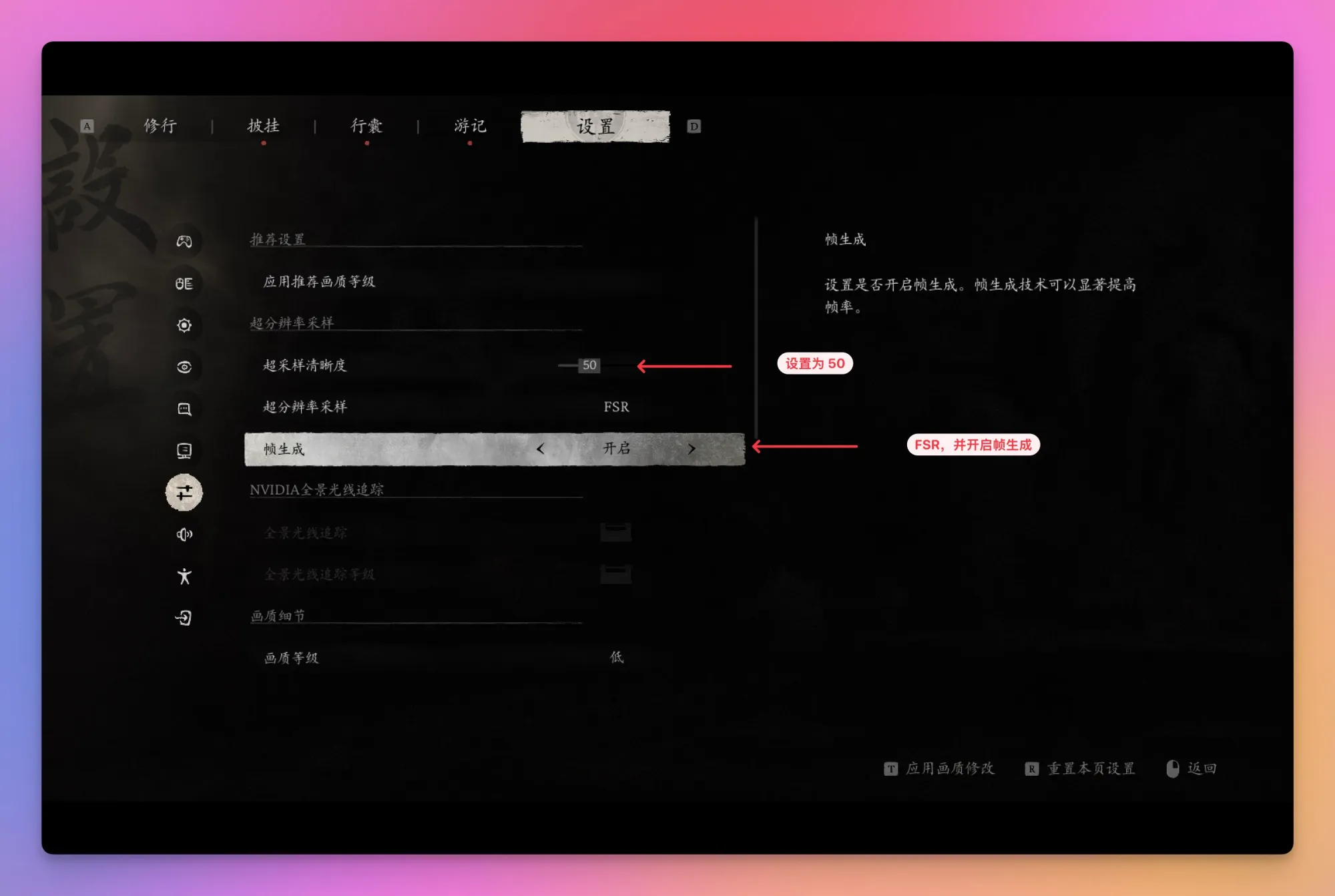- 【超采样清晰度】50左右(可根据帧数适当调高)
