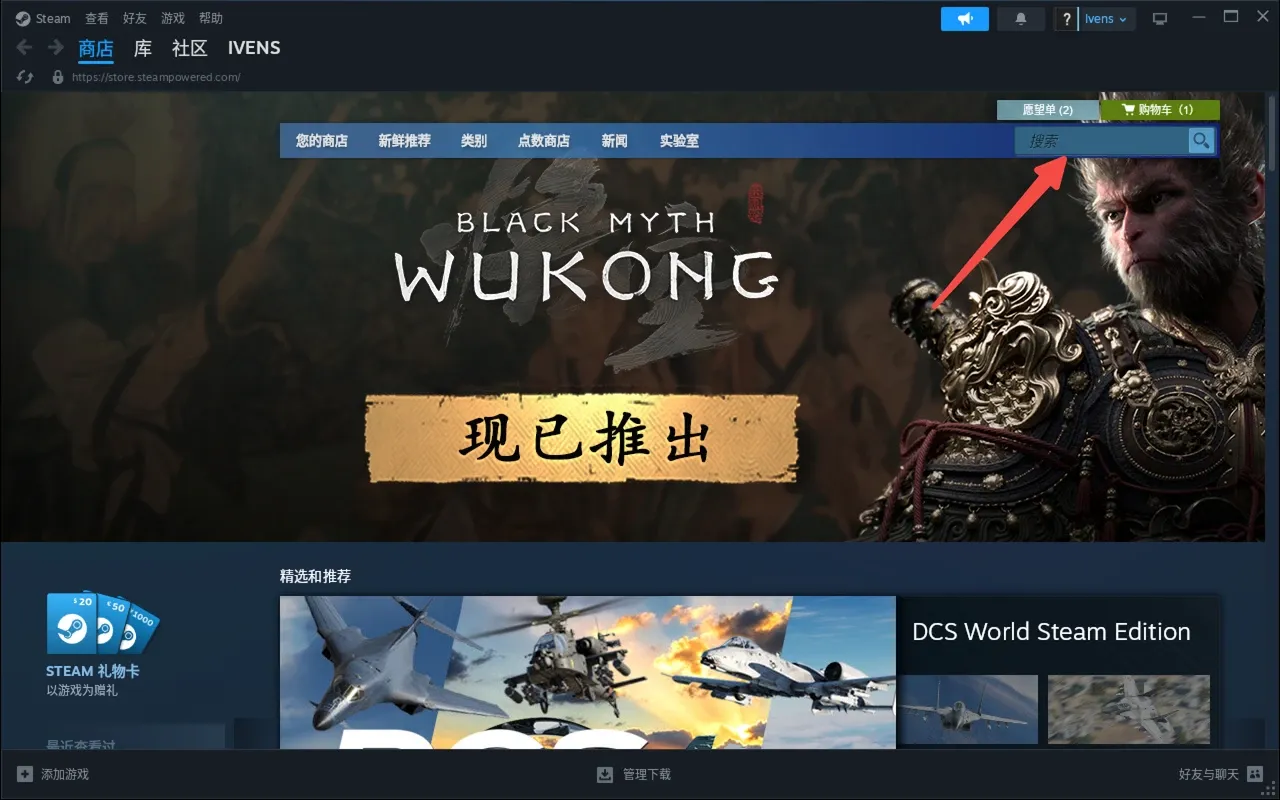 登录后,点击首页黑神话悟空封面,或者在右上角搜索「黑神话」即可找到游戏: