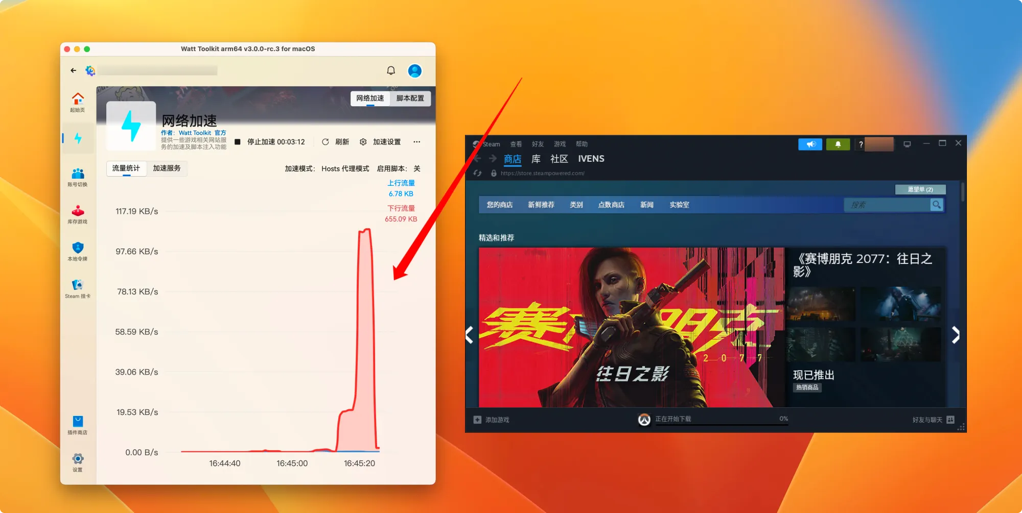 你在 Steam ++ 中应该可以看到成功加速的网络流量👆🏻,说明加速成功🎉。