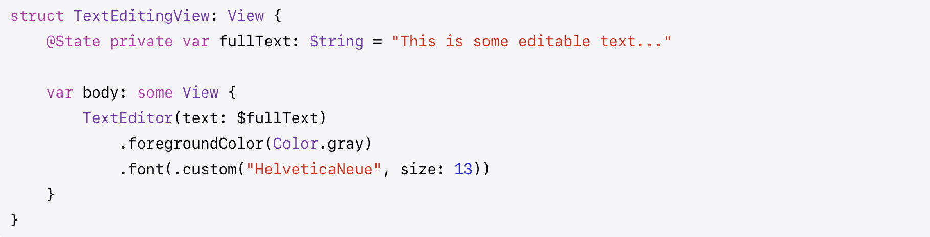 TextEditor() 支持使用 Text() 组件的修饰器,例如 .font、.foregroundColor。