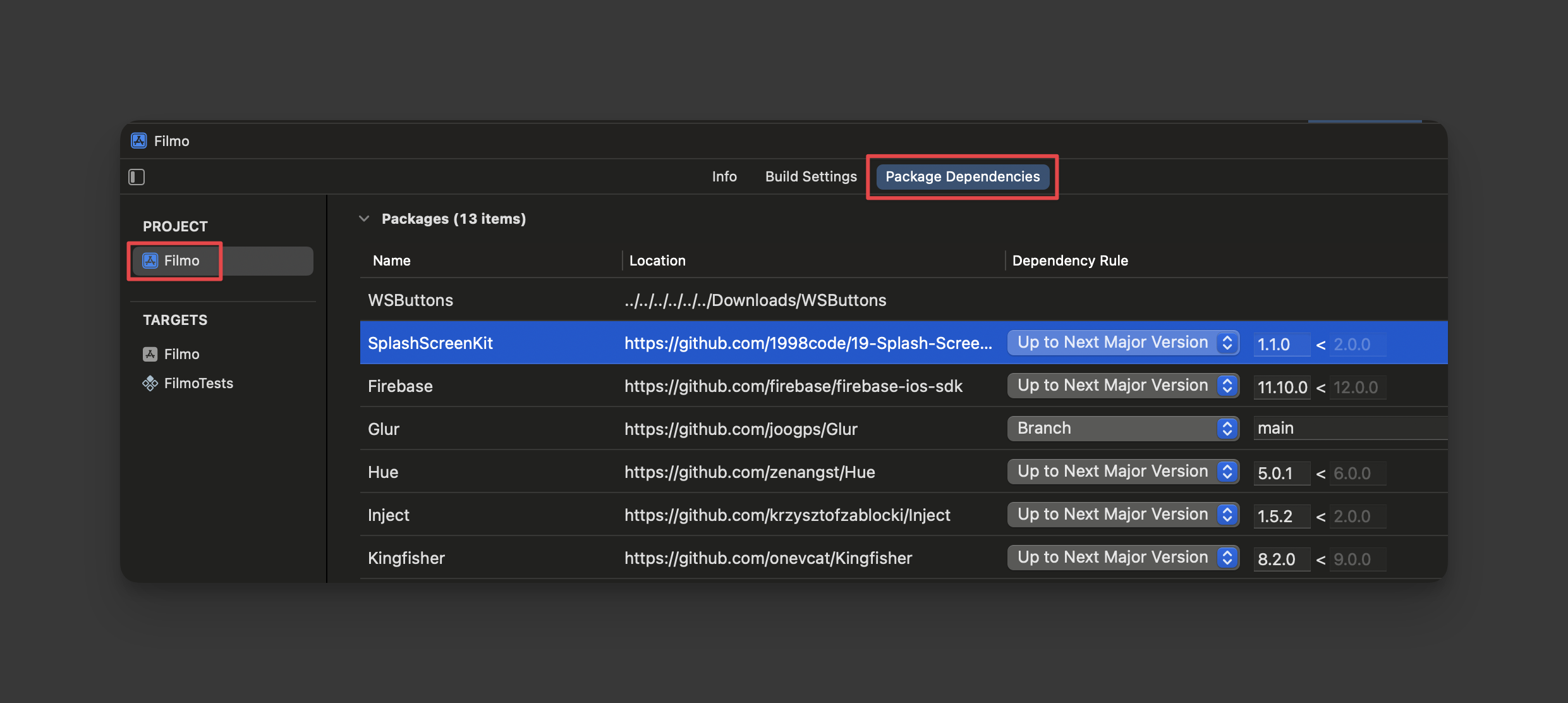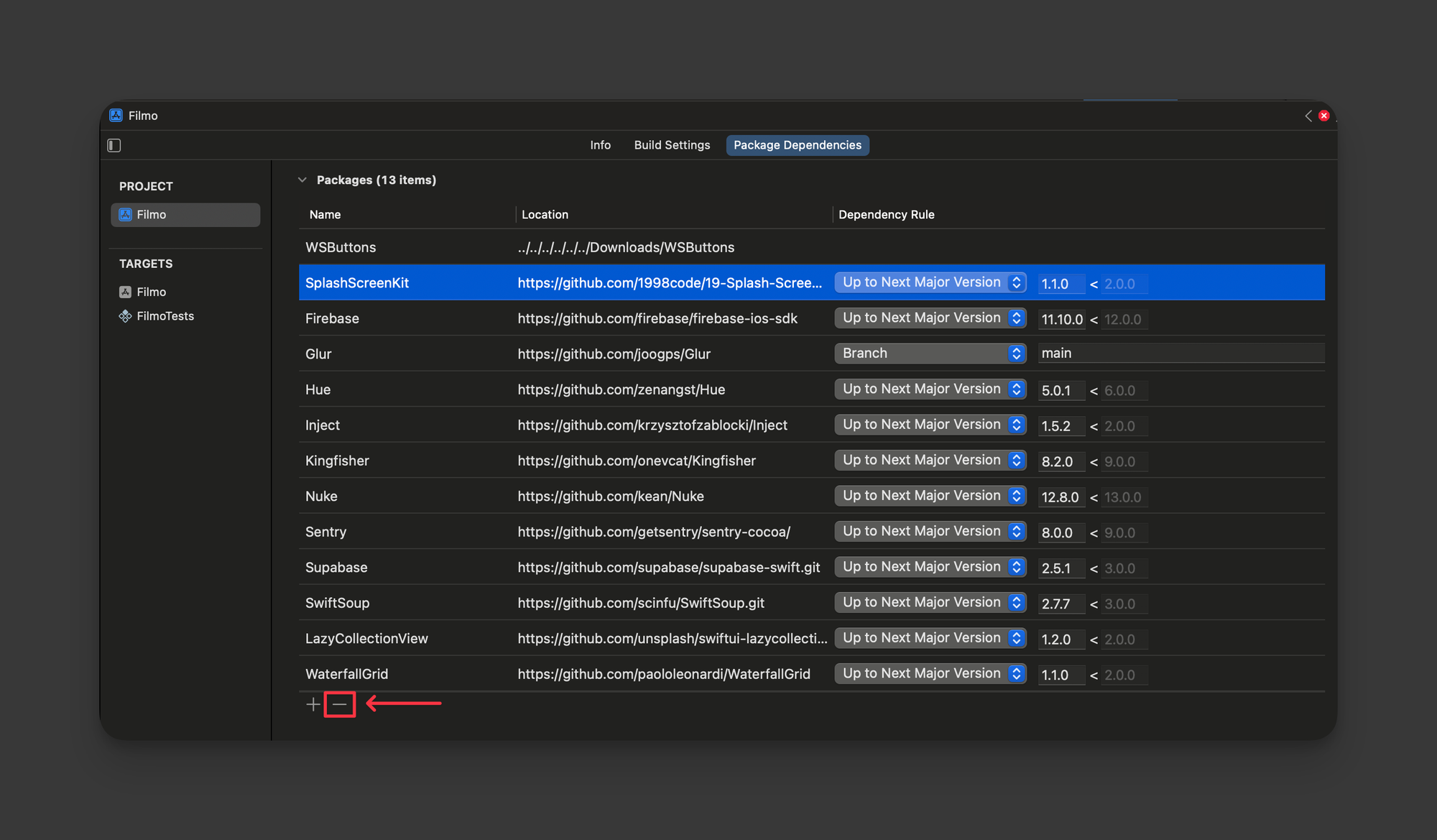 选项 Xcode 目标文件,然后选择 PROJECT -> Package Dependencies: