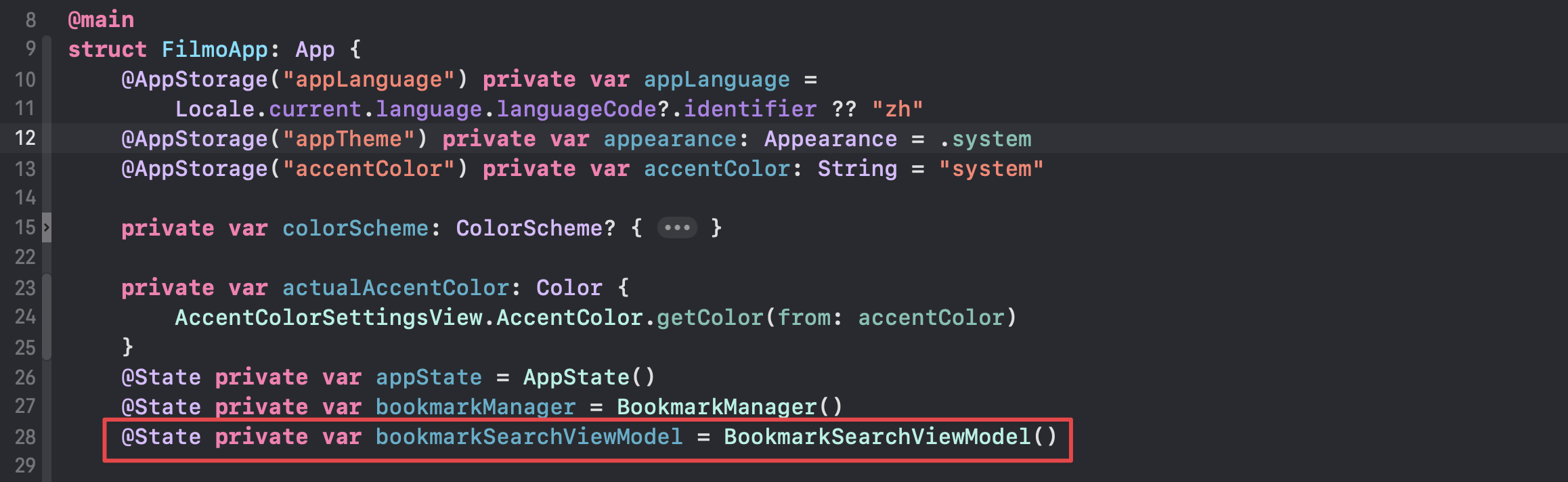 在 Filmo 项目中,最初我在 App 入口文件中创建一个 ViewModel 实例,并通过.environment() 注入环境: