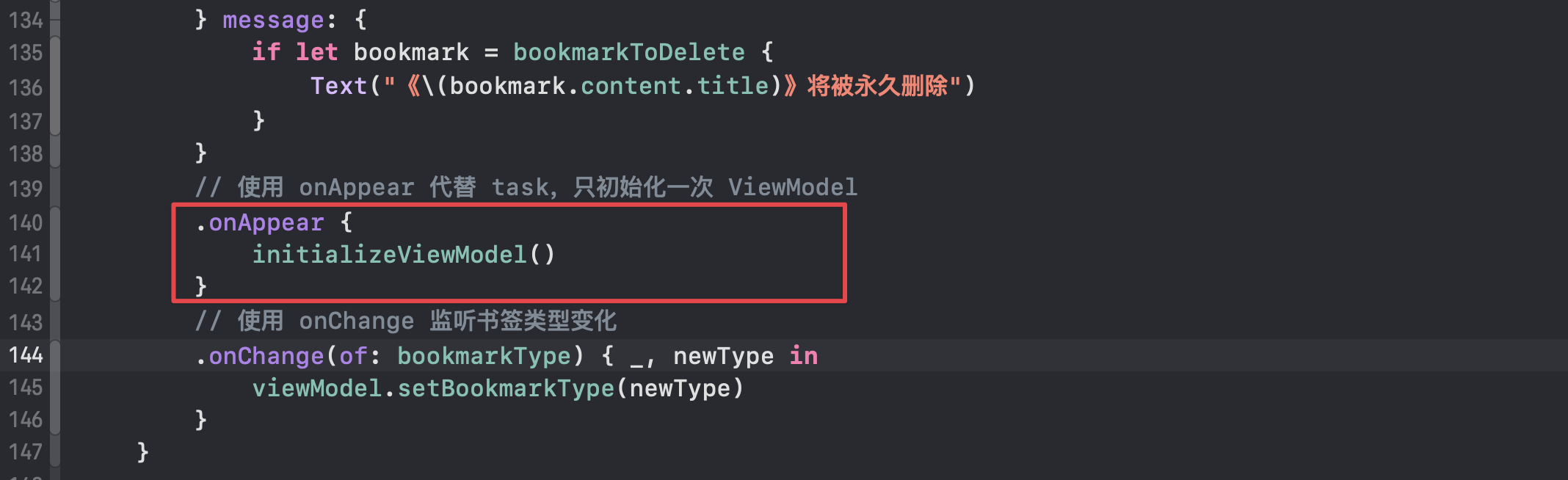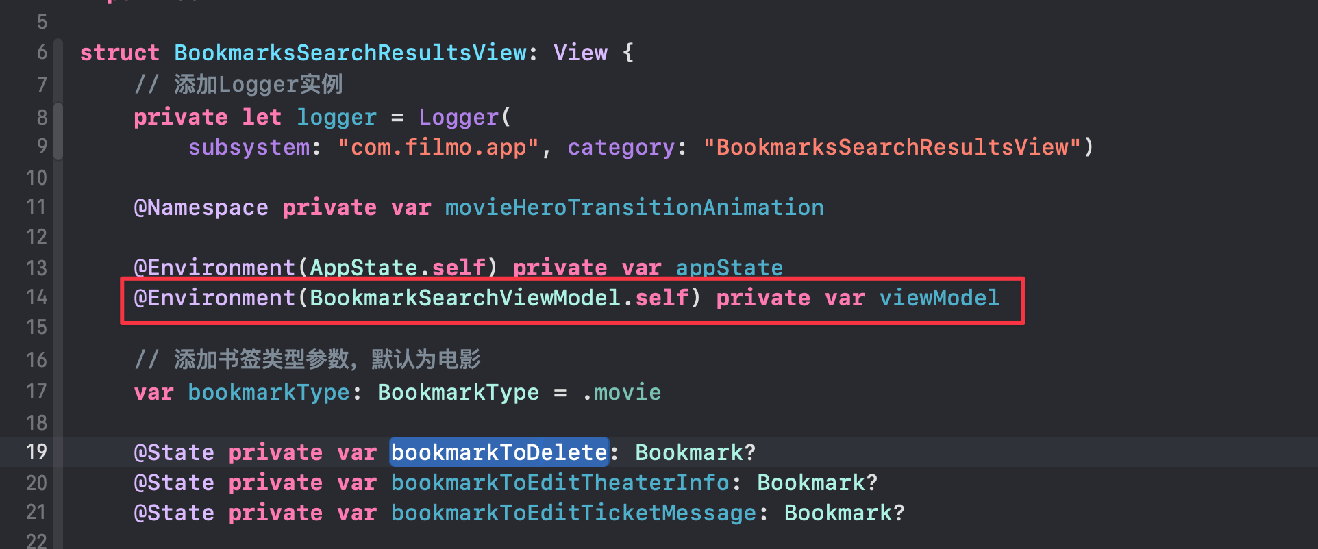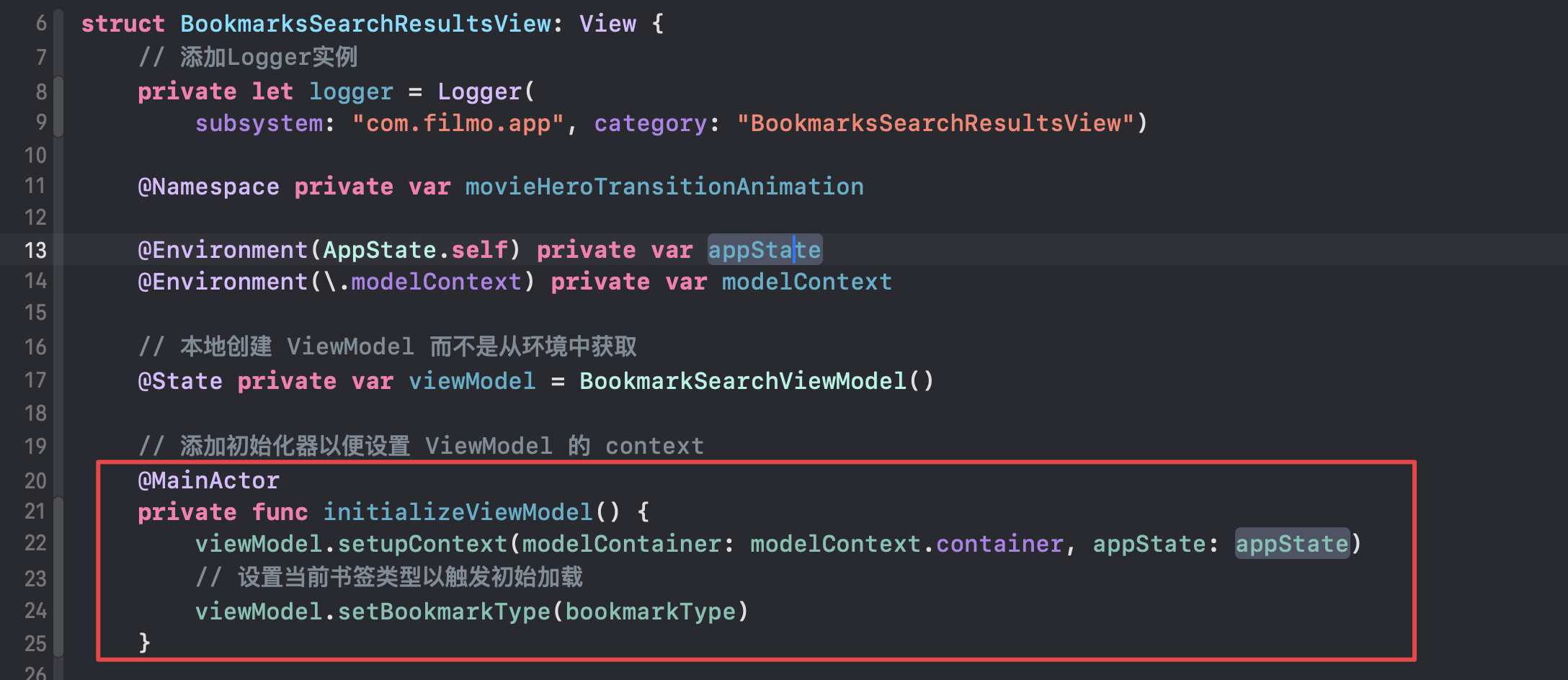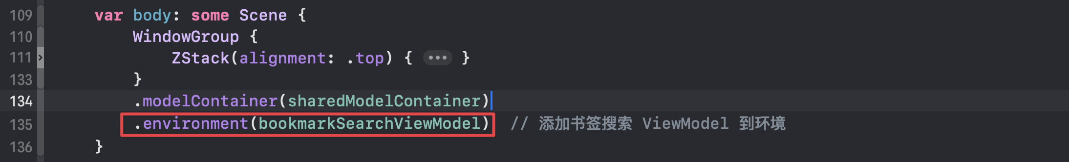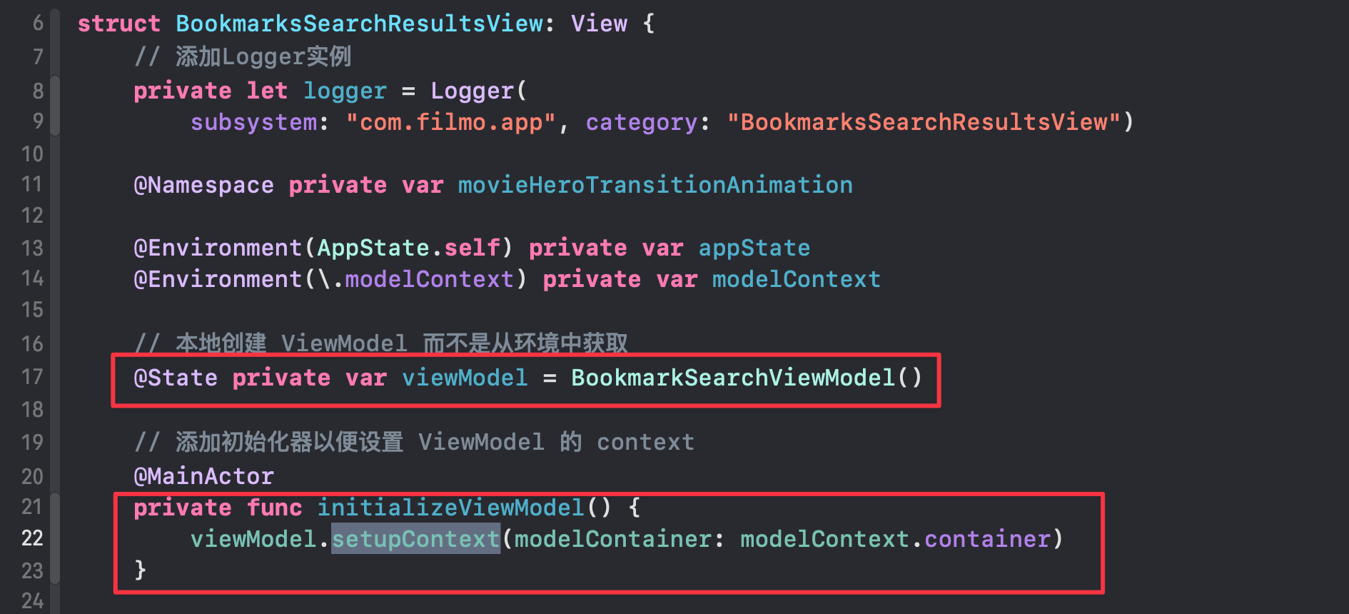 @State private var viewModel = BookmarkSearchViewModel() 通过 setupContext 注入依赖