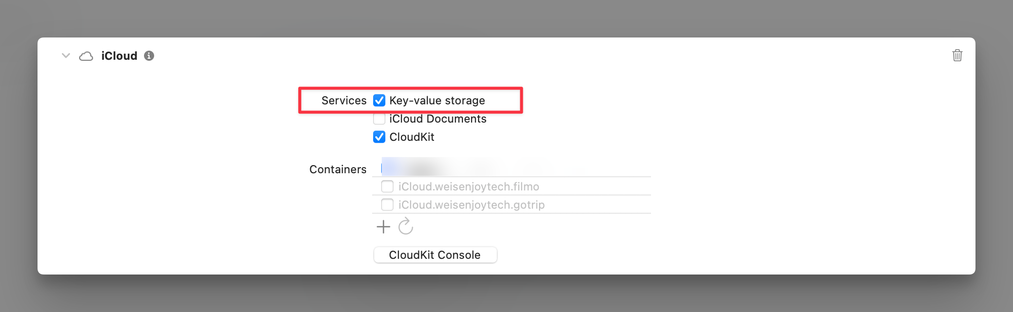 和启用 CloudKit 云同步类似,我们需要手动为项目添加 Key-value storage 同步支持: