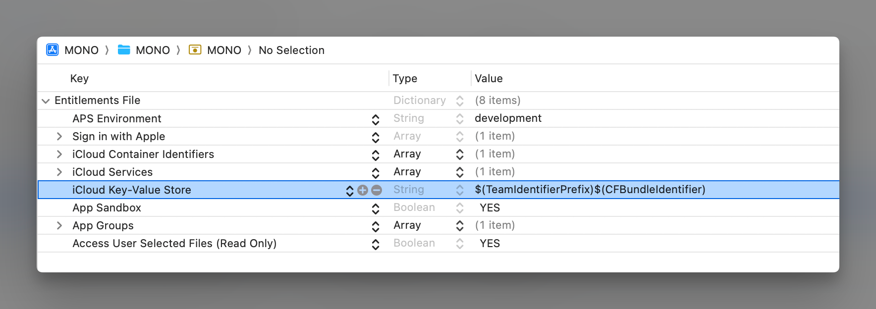 为项目添加Key-value storage 同步之后,在 .entitlements 文件中(不是 info.plist),Xcode 会自动添加 iCloud Key-Value Store 键值对: