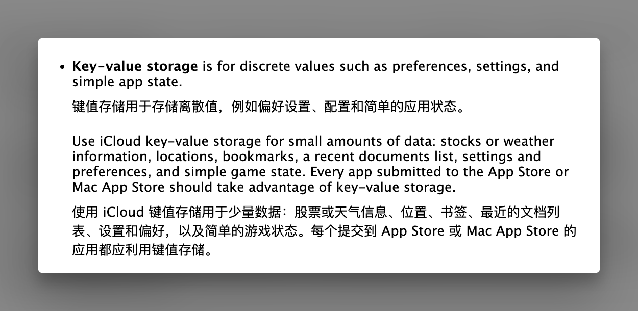 NSUbiquitousKeyValueStore非常适合用于存储用户偏好设置,以及一些微小且非敏感的数据。使用 NSUbiquitousKeyValueStore 时,总空间被限制为 1 MB。因此,不要用它来存储大量数据。