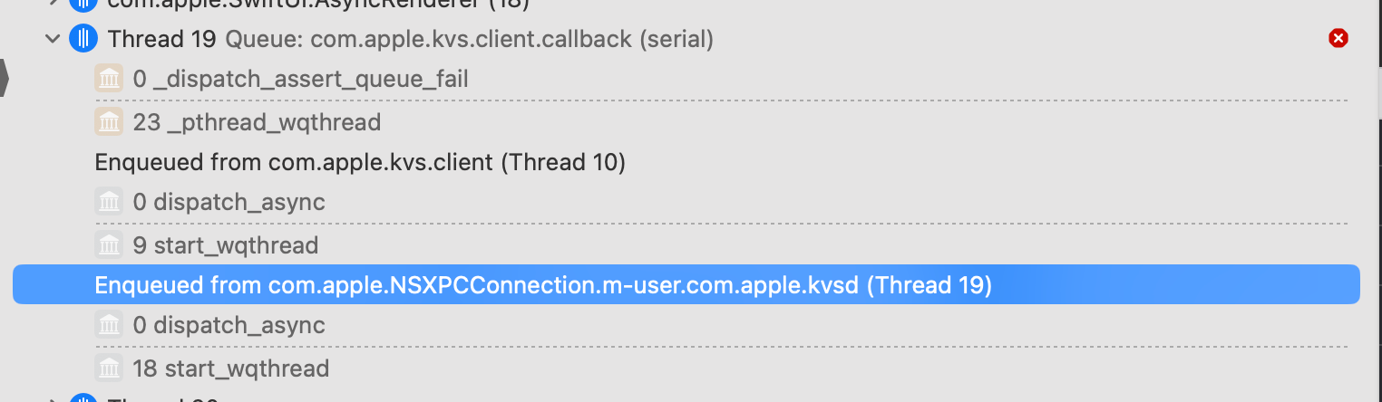 xcode 的错误提示为 Enqueued from com.apple.kvs.client (Thread 40),但没有更详细的错误日志,也没有定位到具体是哪行代码的问题。