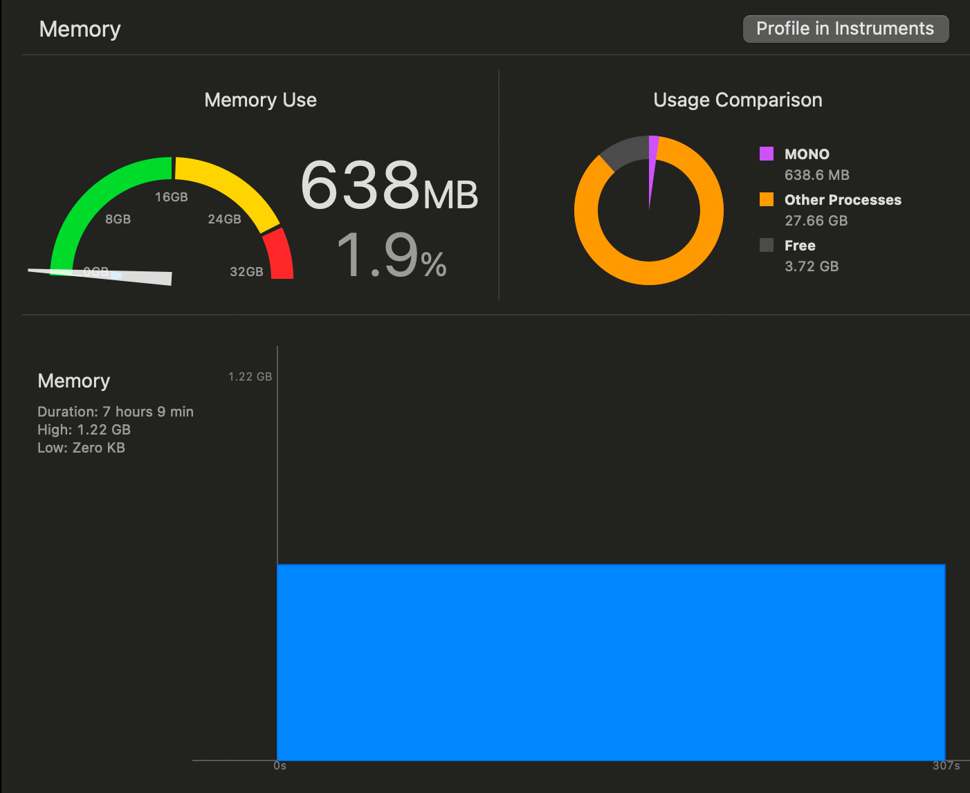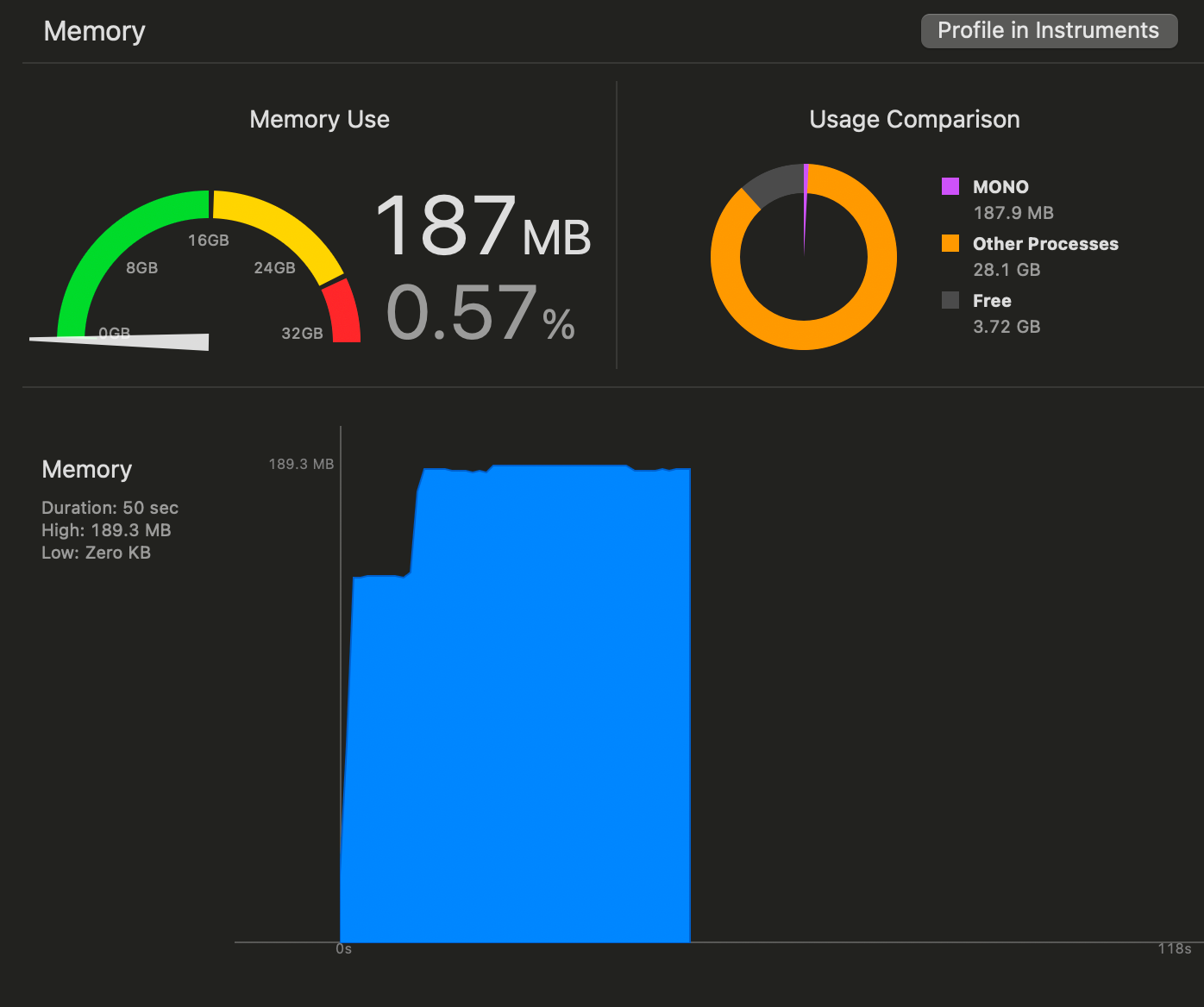 在以下示例中,同时展示 20 张图片时,内存占用从不到 100MB 突增至 600MB。虽然每张图片的文件大小已压缩至不足 1MB,但在显示时,由于图片被解码为未压缩的像素数据,其内存占用显著增加。