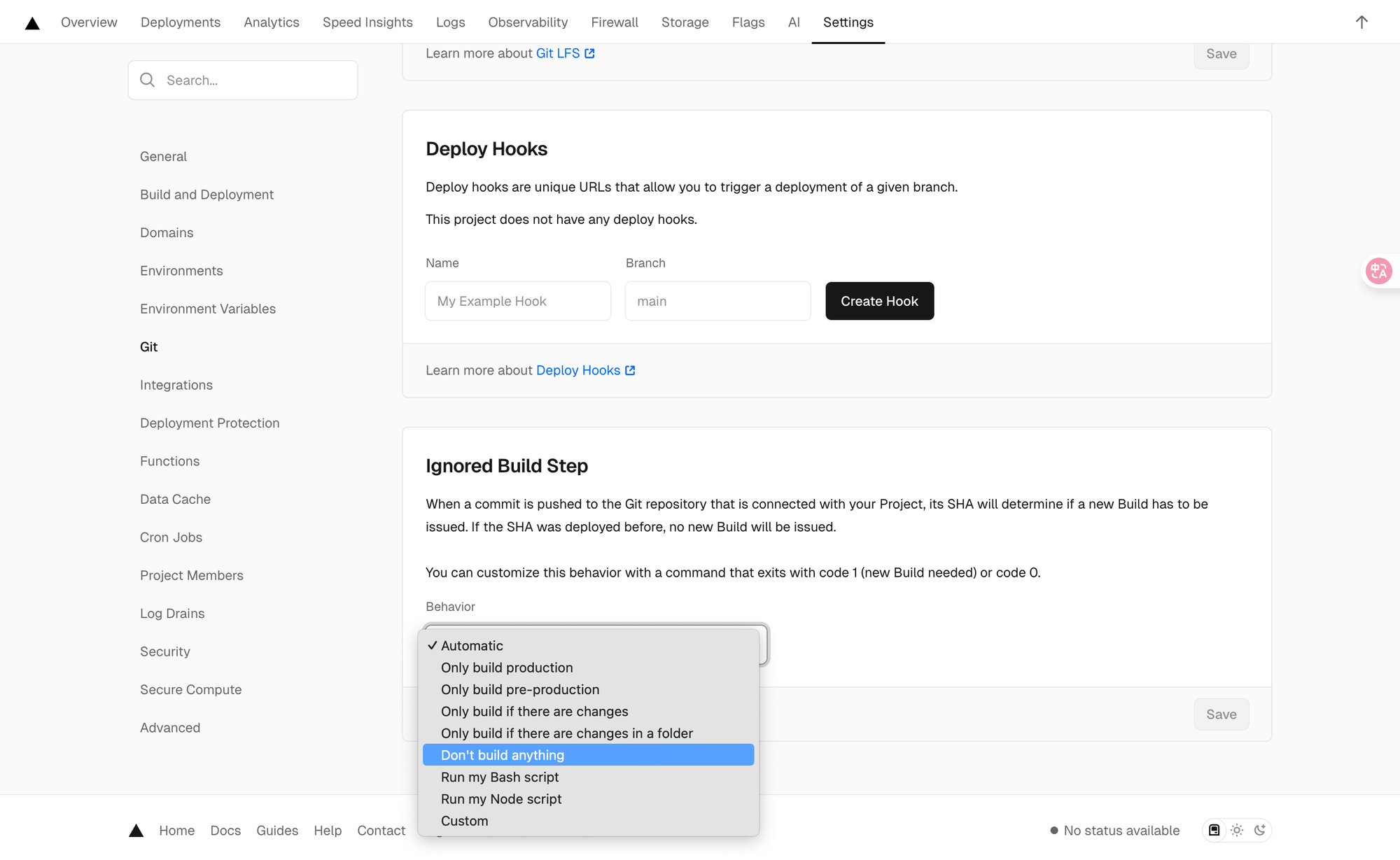 默认情况下,Vercel 会为推送到关联 Git 仓库的每个提交创建新部署和构建(除非跳过构建步骤)