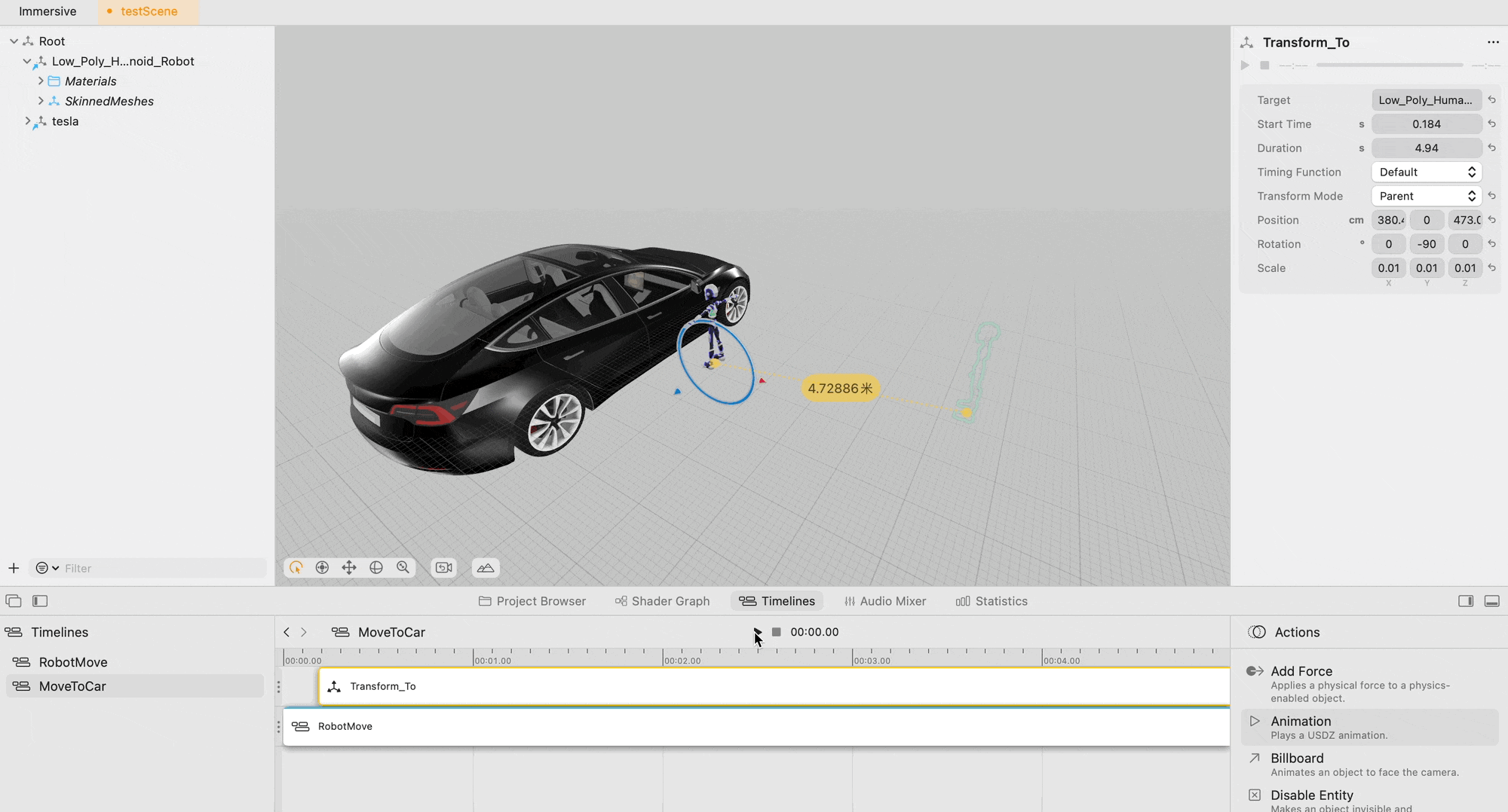 这样我们就完成了设置,当 Car 实体被用户点击时,即可播放 MoveToCar 动画。