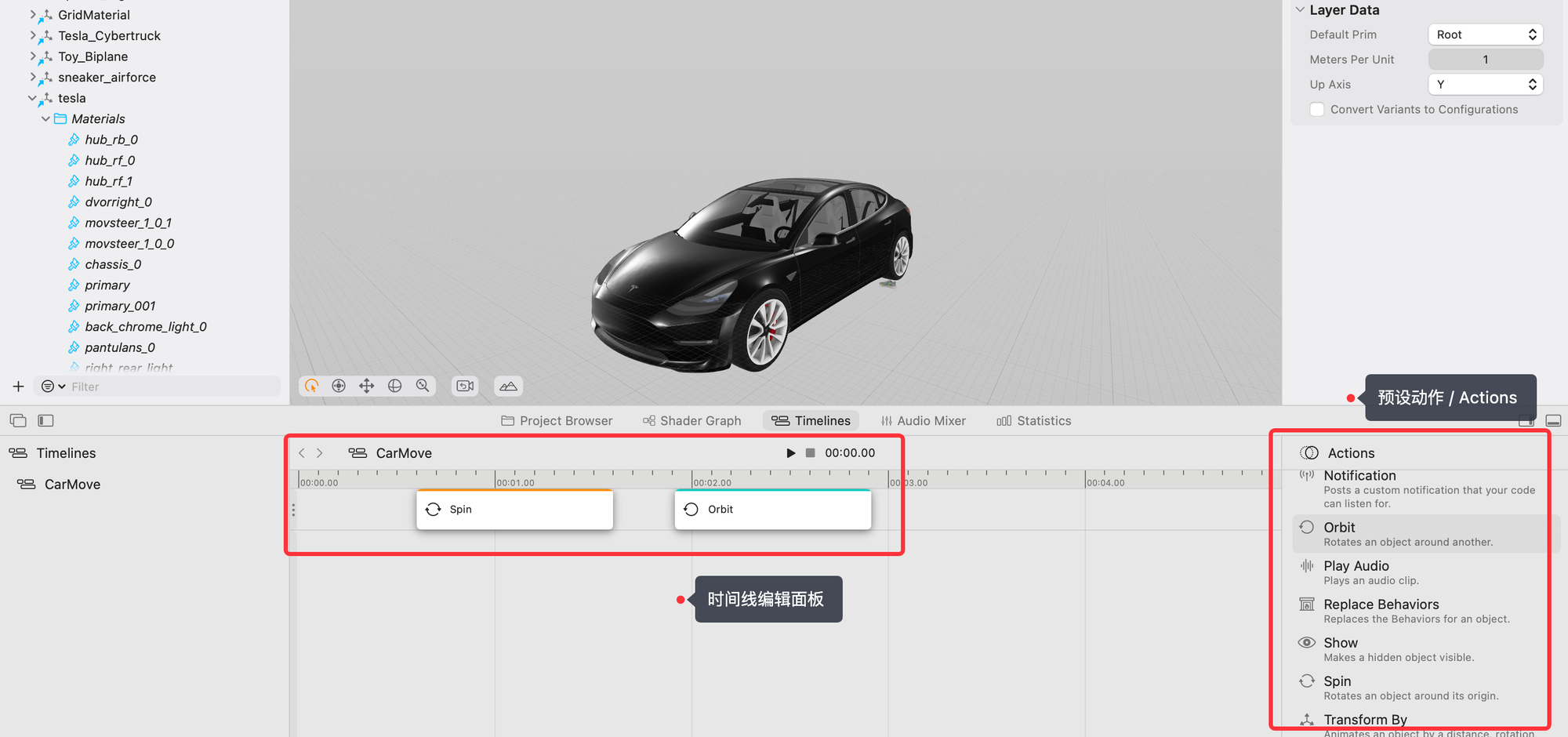Reality Composer Pro 为 Timelines 模块内置了一些列预设的动作效果,可以直接拖拽添加到对象中: