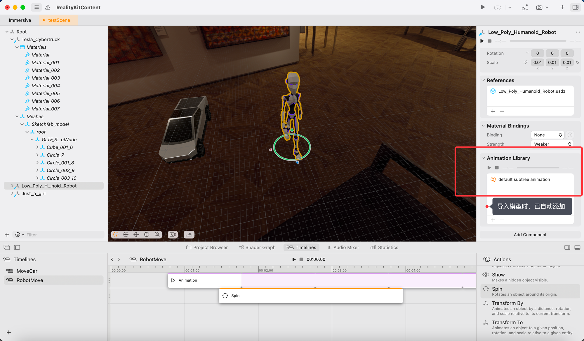 如果 USDZ 模型自带动画效果(通常使用 Blender/Maya 创建,并一并导出到 USDZ 文件中),则 Reality Composer Pro 会自动创建 Animation Library Component,并将默认动画添加到其中。