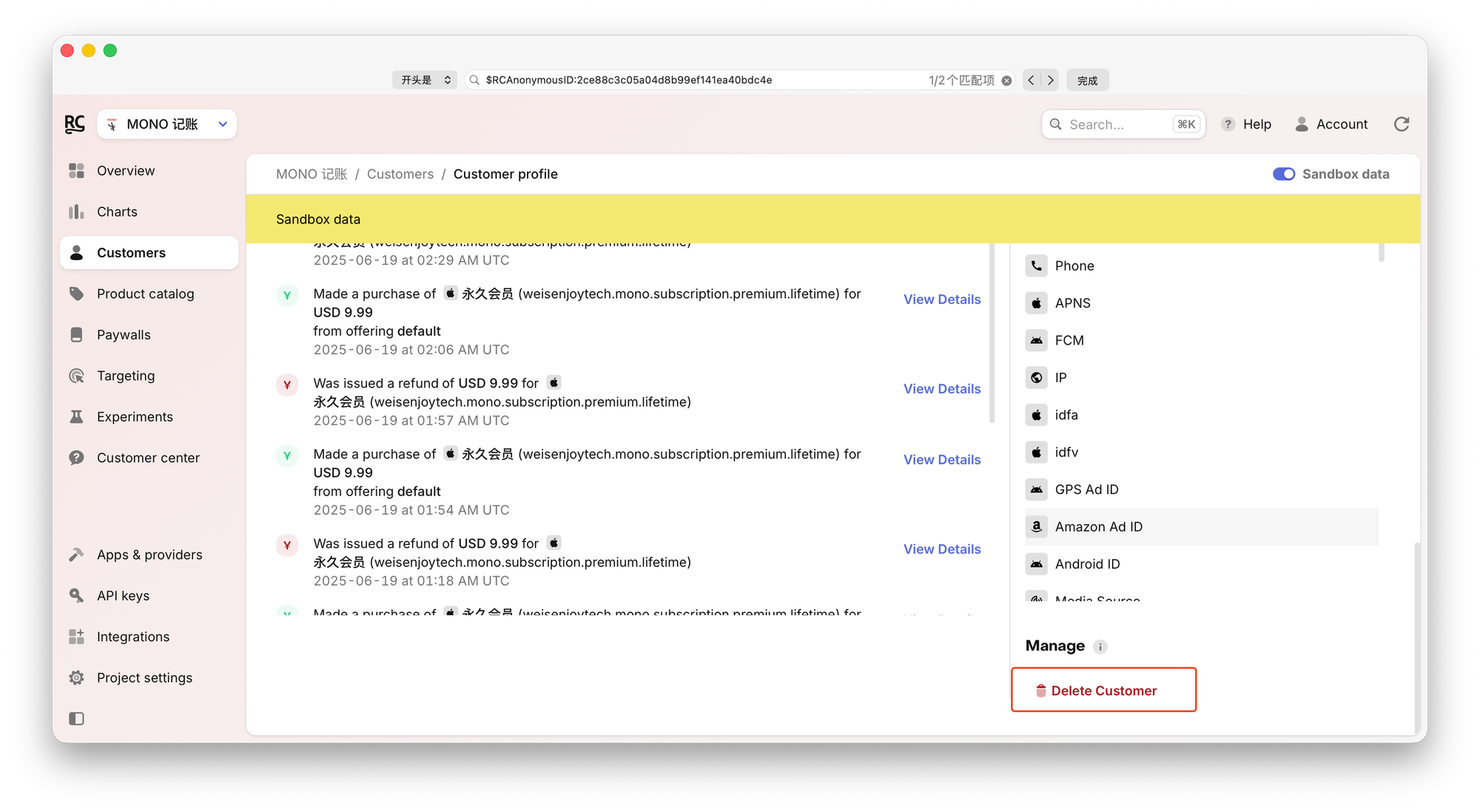 删除之后,RevenueCat 这条数据仍然不会更新: