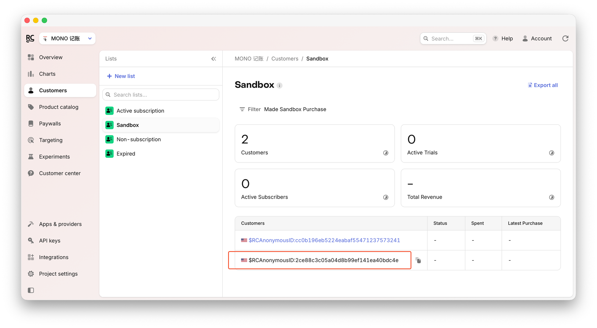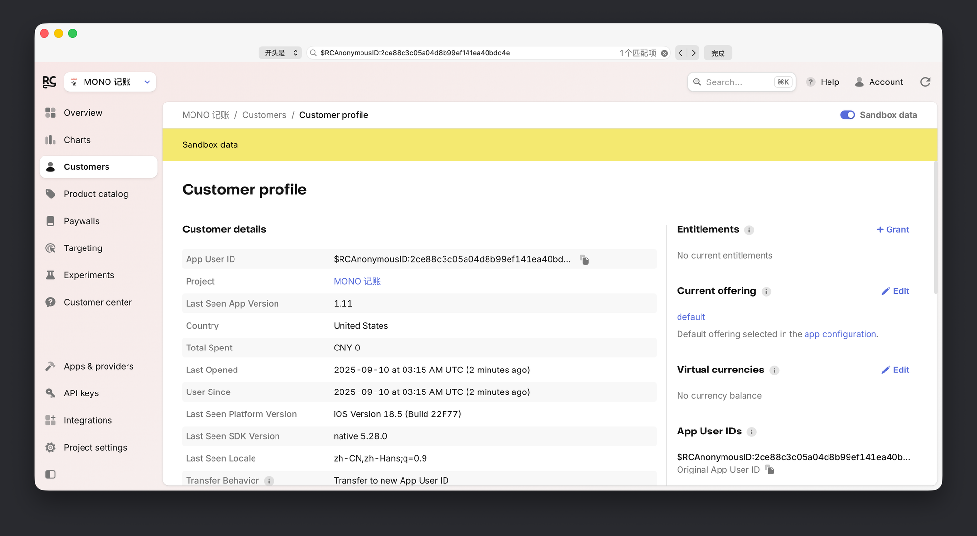 点击无法查看详情,提示错误「No customer found with that App User ID. Please note that it's an exact search.」,这是 RevenueCat 的一个 Bug。