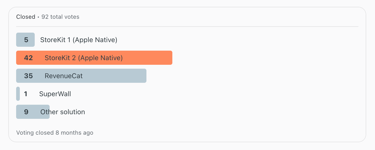 Reddit 论坛在 2024 年下旬的一个调查中,可以看到 RevenueCat 使用率远高于 Superwall。
