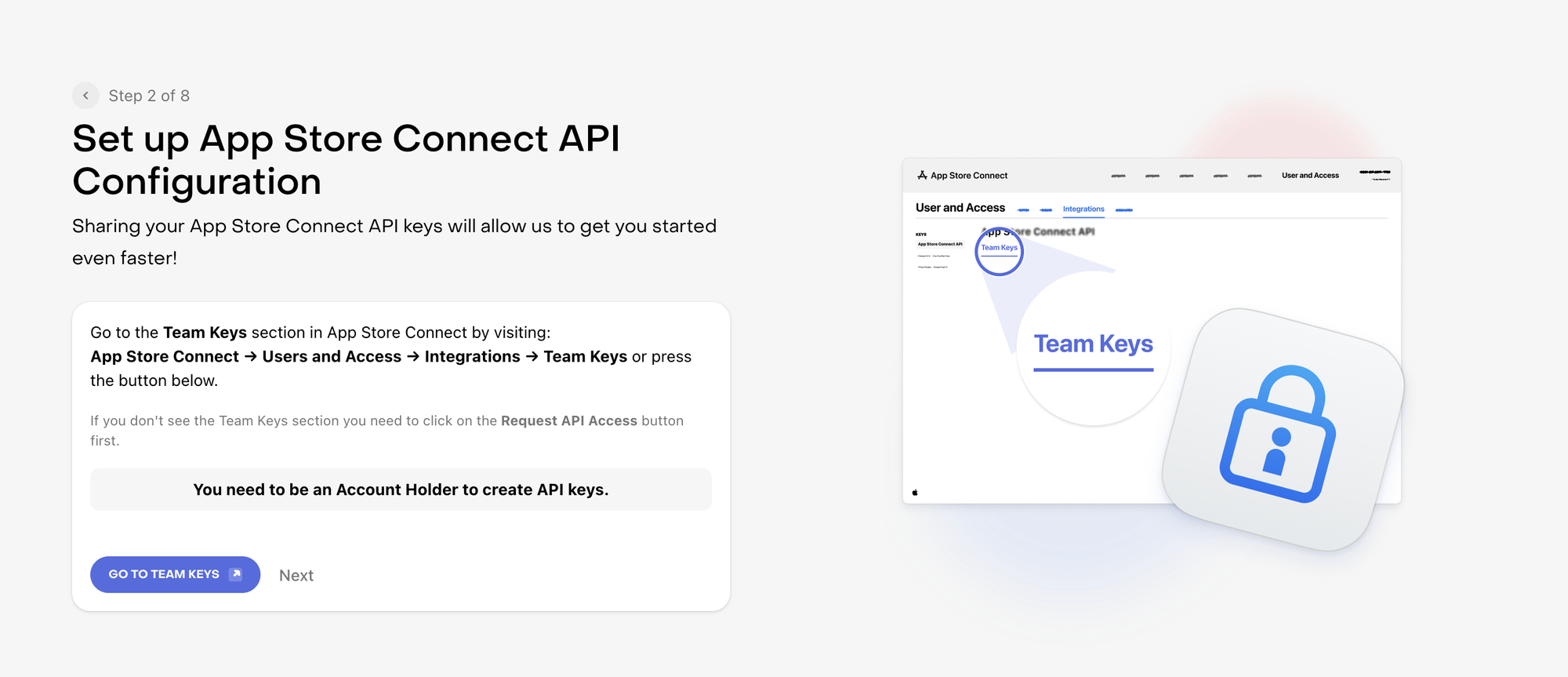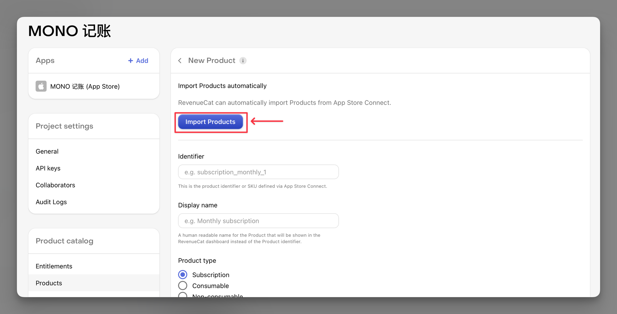 注册 RevenueCat 之后,按照提示在 App Store Connect 中创建 API 密钥并上传到 RevenueCat 中。
