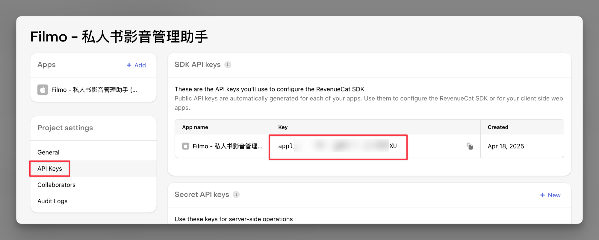 这个密钥是因为让 RevenueCat 有权限访问我们有哪些项目。