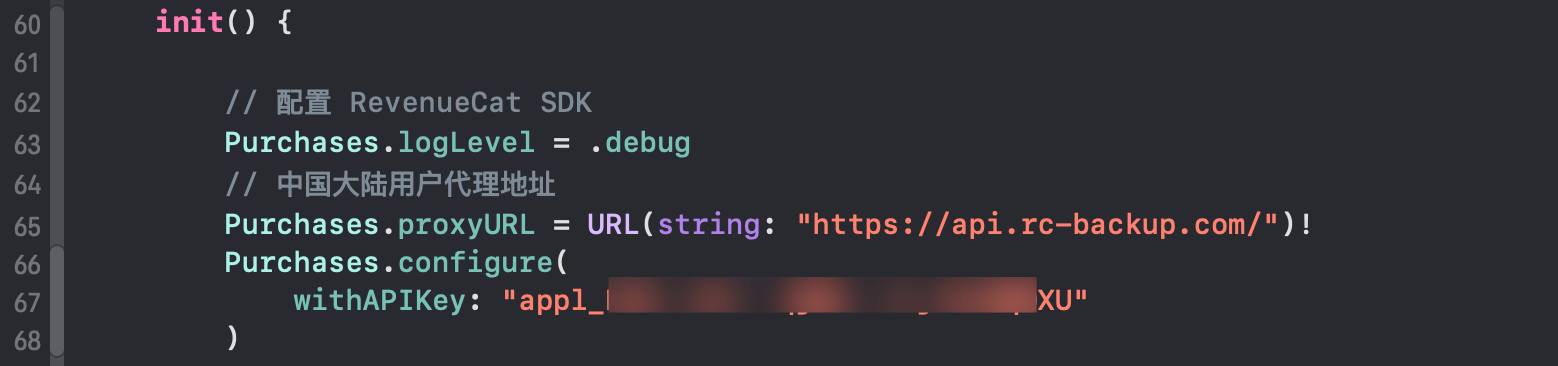 在 App 文件初始化器中配置,继续传递 withAPIKey 参数即可,无需传递appUserID 参数,RevenueCat 会自动生成。