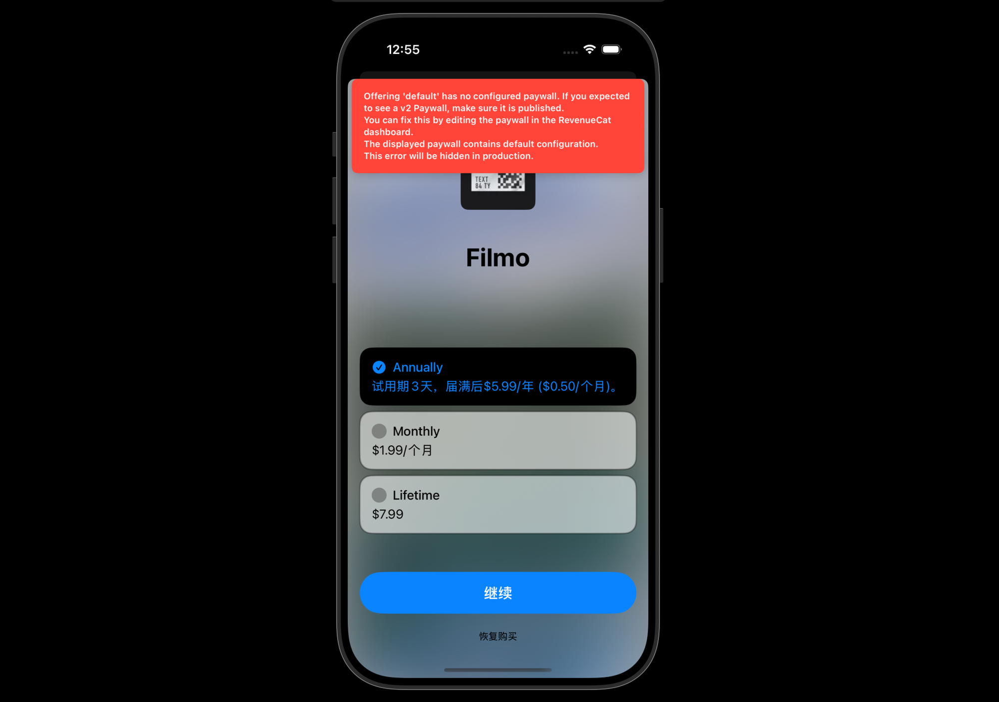 }如果还没有设置自定义的 Paywall 界面,RevenueCat 会自动从 Apple 获取配置的产品和优惠方案,并创建一个默认的付费墙界面: