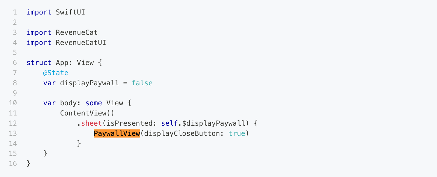import RevenueCatUI RevenueCat SDK 提供了一个.presentPaywallIfNeeded()修饰符,用于根据用户的当前权益,自动决定是否显示付费墙界面。
