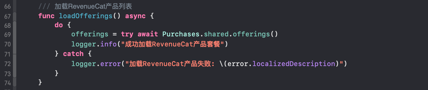 我在 RevenueCatManager 中,创建一个 loadOfferings() 方法,用于加载 offerings 数据。
