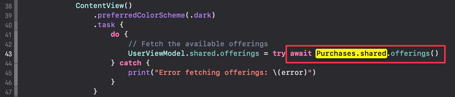 只需配置一次 Purchases,通常推荐在 App 文件中完成。配置后,通过访问 SDK 中的.shared 实例即可在整个应用中共享同一实例。