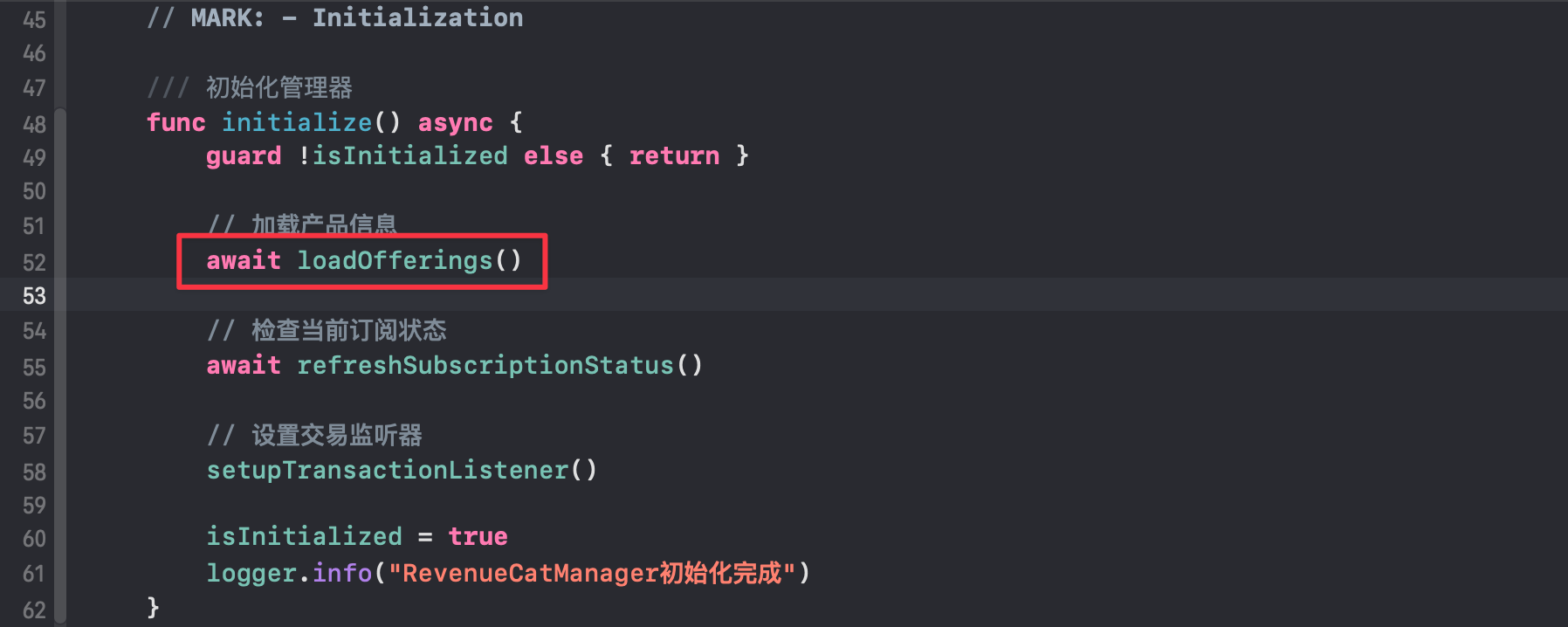然后在 RevenueCatManager 的 initialize() 初始化方法中调用它: