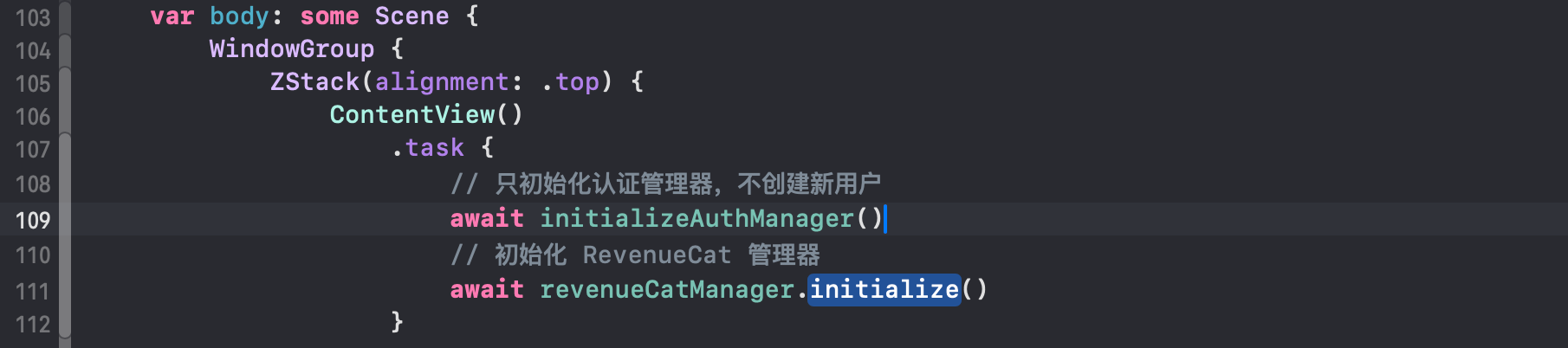 最佳实践是在 App 入口文件中,创建 RevenueCatManager 实例,并调用 RevenueCatManager.initialize() 初始化方法。