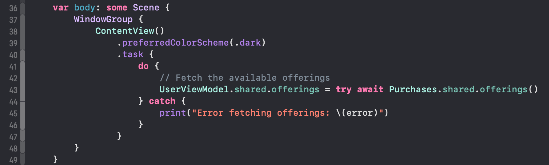 使用最新的符合 Swift 并发的 Purchases.shared.offerings() 方法来获取产品(Offerings)。避免使用之前的 Purchases.shared.getOfferings() 方法,RevenueCat 官方文档还没有更新。