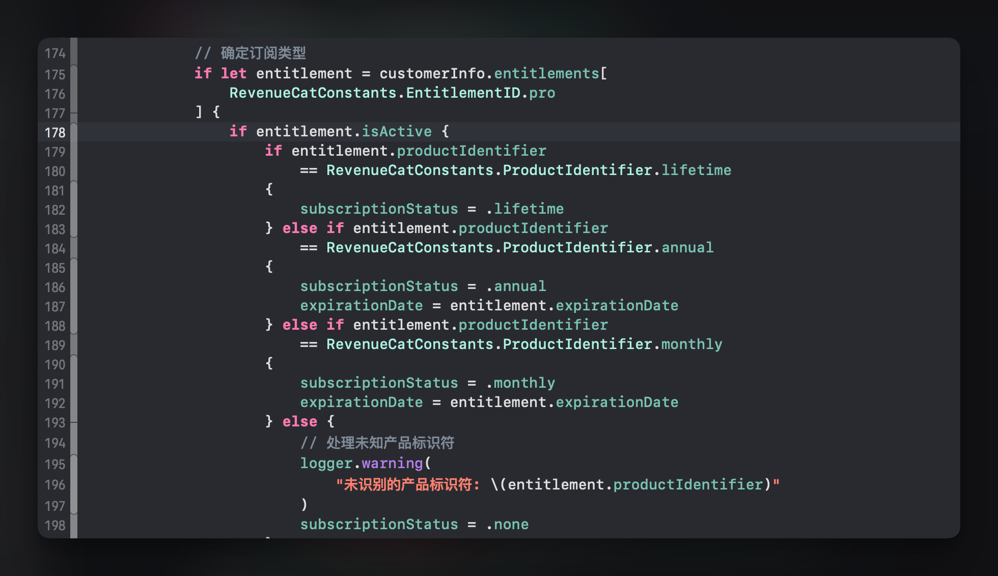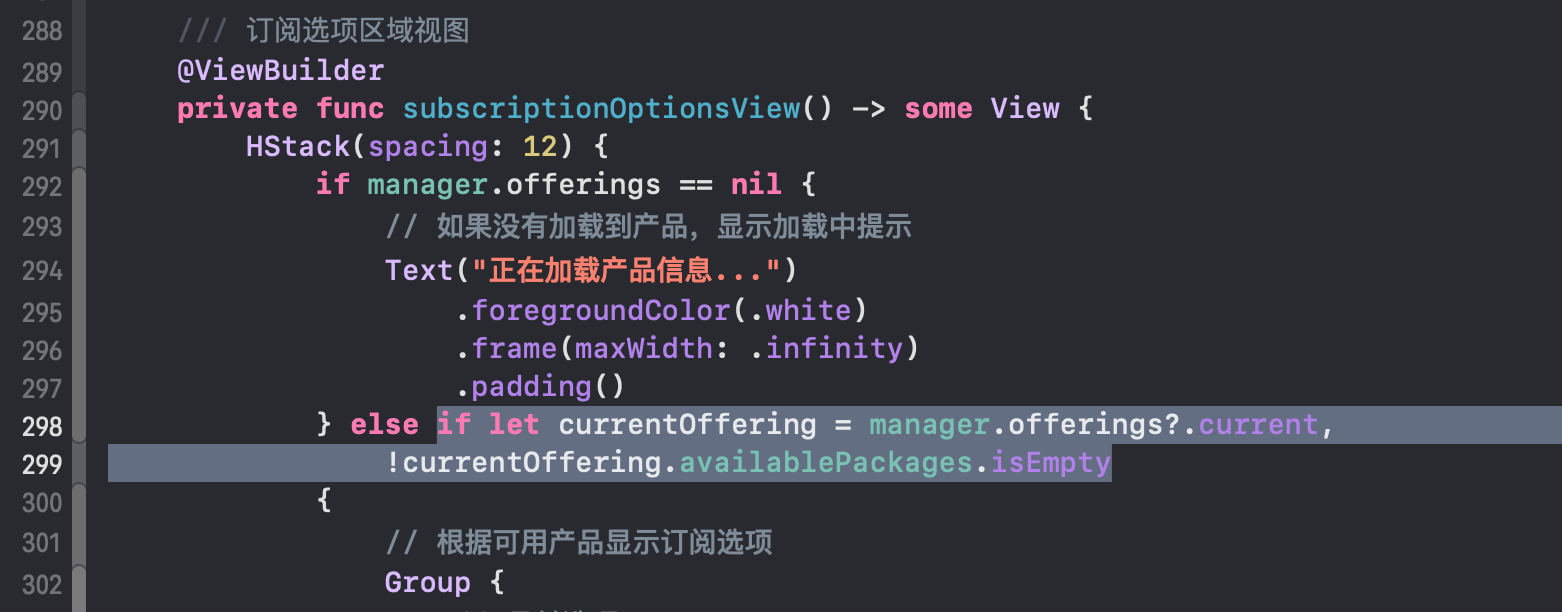 在 RevenueCat 提供的示例项目中,也是在 App 文件中完成初始化。不过,示例项目使用单例模式,因为它是在 iOS17 之前的项目,还不支持 Observation 框架。
