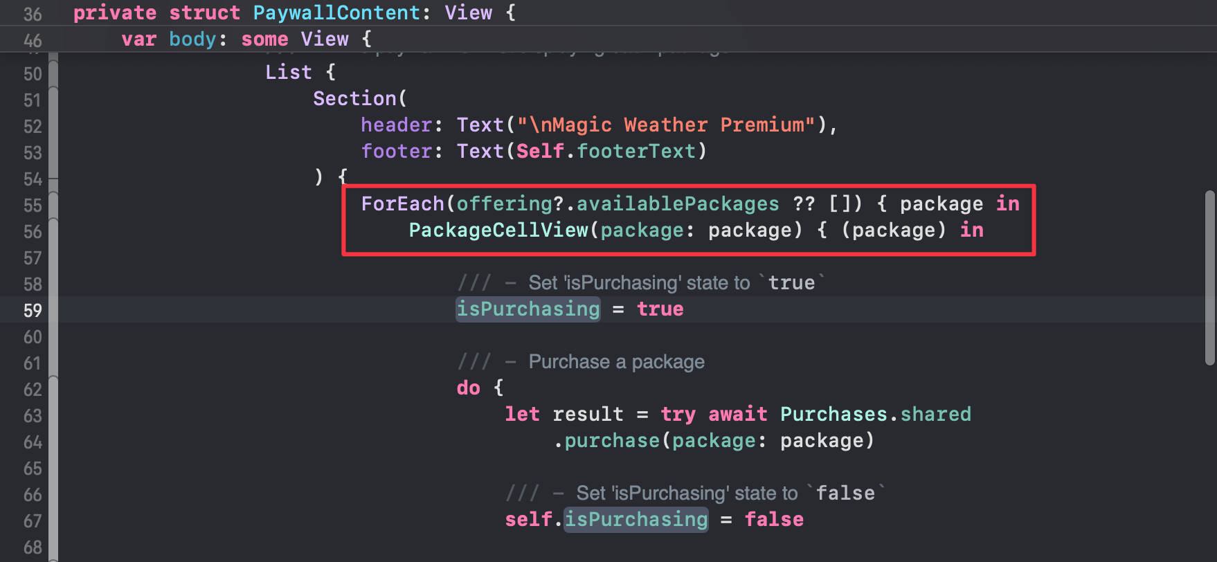 在 RevenueCat 示例项目中,使用 ForEach 遍历 offering.availablePackages 用于展示和购买: