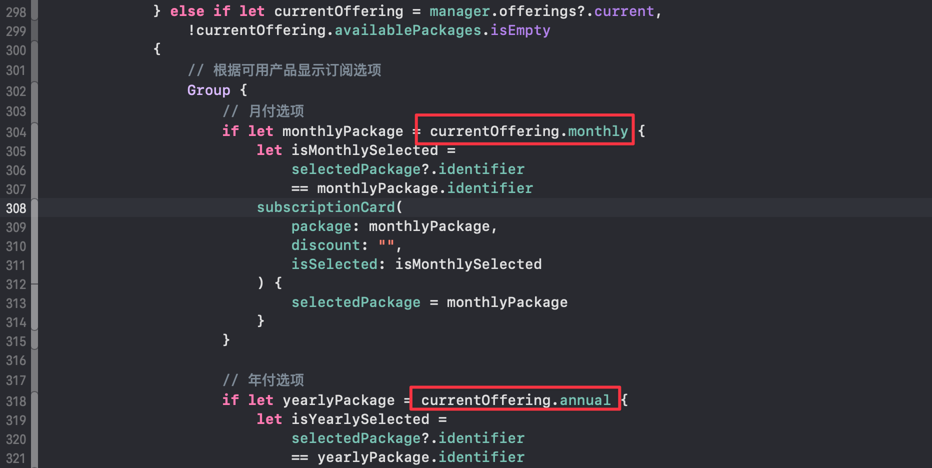 默认情况下,一个 Project 只有一个 offering,此时可以通过 offerings.current 来获取默认的 offering 套餐。