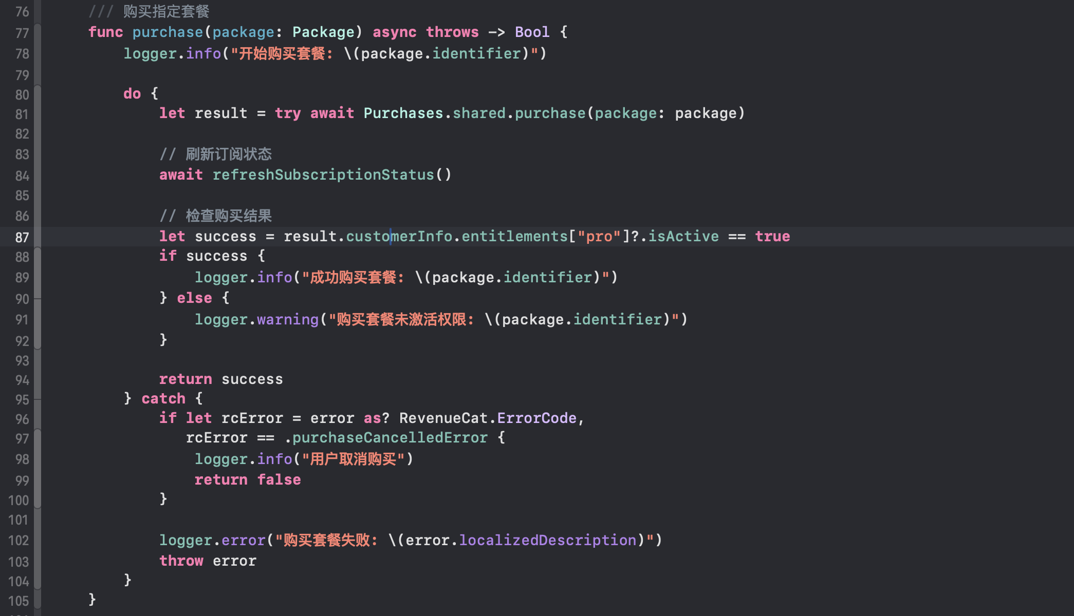 我在 RevenueCatManager 中创建一个 purchase() 方法,完成商品购买,并格外增加了订阅状态刷新、日志输出等功能: