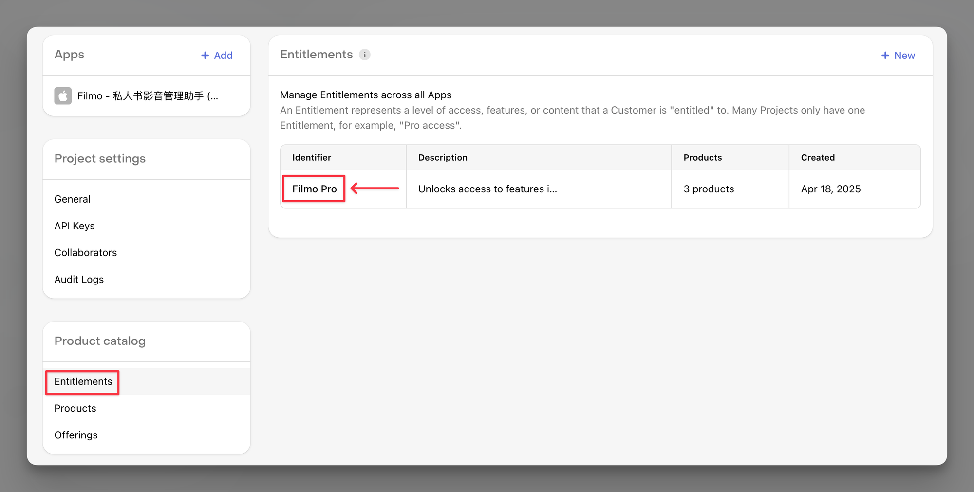 entitlement_id 可以在 RevenueCat 网页端查询: