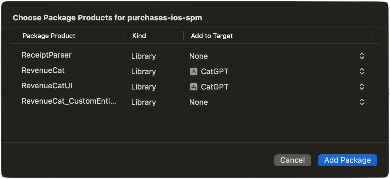 https://github.com/RevenueCat/purchases-ios-spm.git仅需要勾选RevenueCat 和 RevenueCatUI :