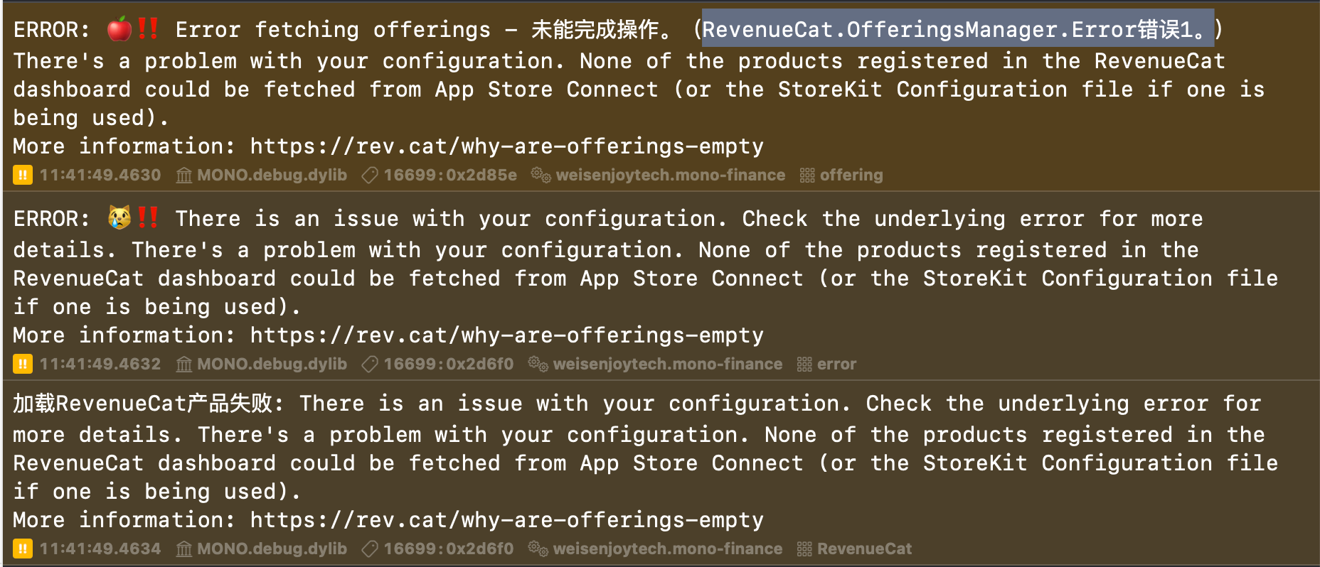 经过检查,确保 product id 均配置正确的情况下,仍然出现该错误。这个问题出现在模拟器上。