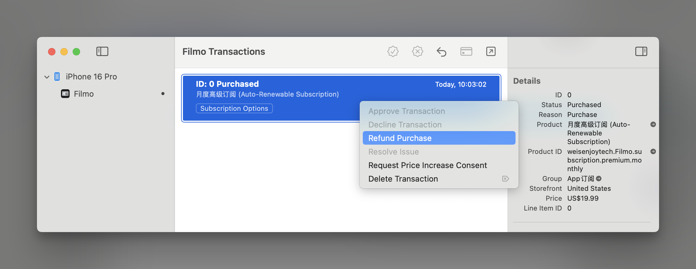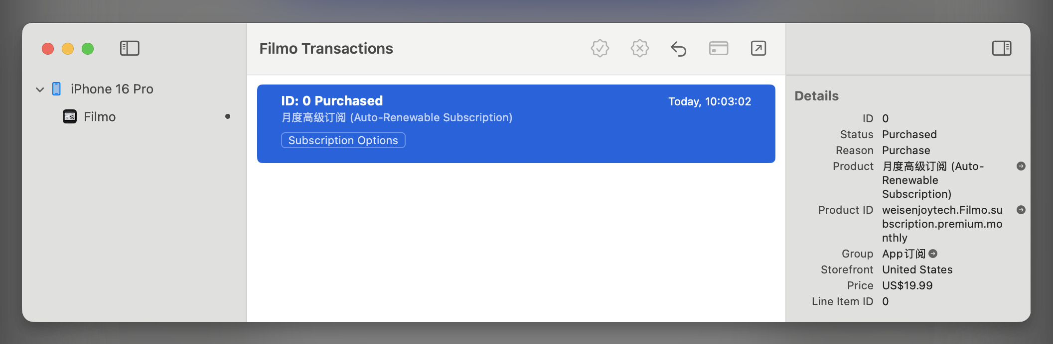 点击 Xcode 下方的 Manage Store Transactions 按钮,可以查看在开发环境中的交易记录: