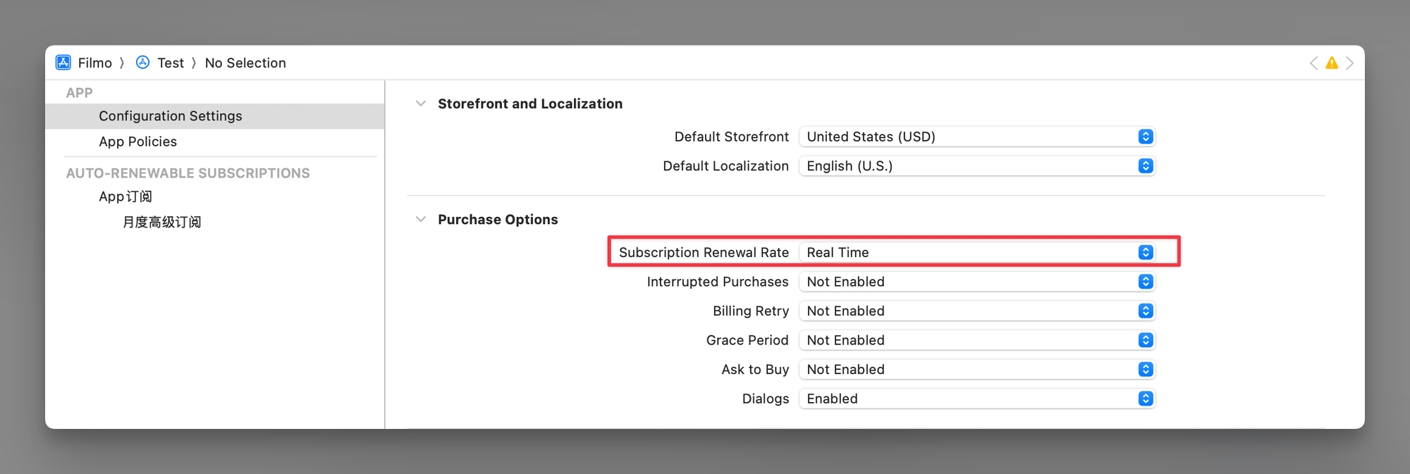 可以在 .storekit 配置文件中,为某个订阅产品设置 Renewal Rate,比如“每 5 分钟续订一次”。这样在测试时,订阅会自动在 5 分钟后续订,方便观察和调试订阅状态变化。