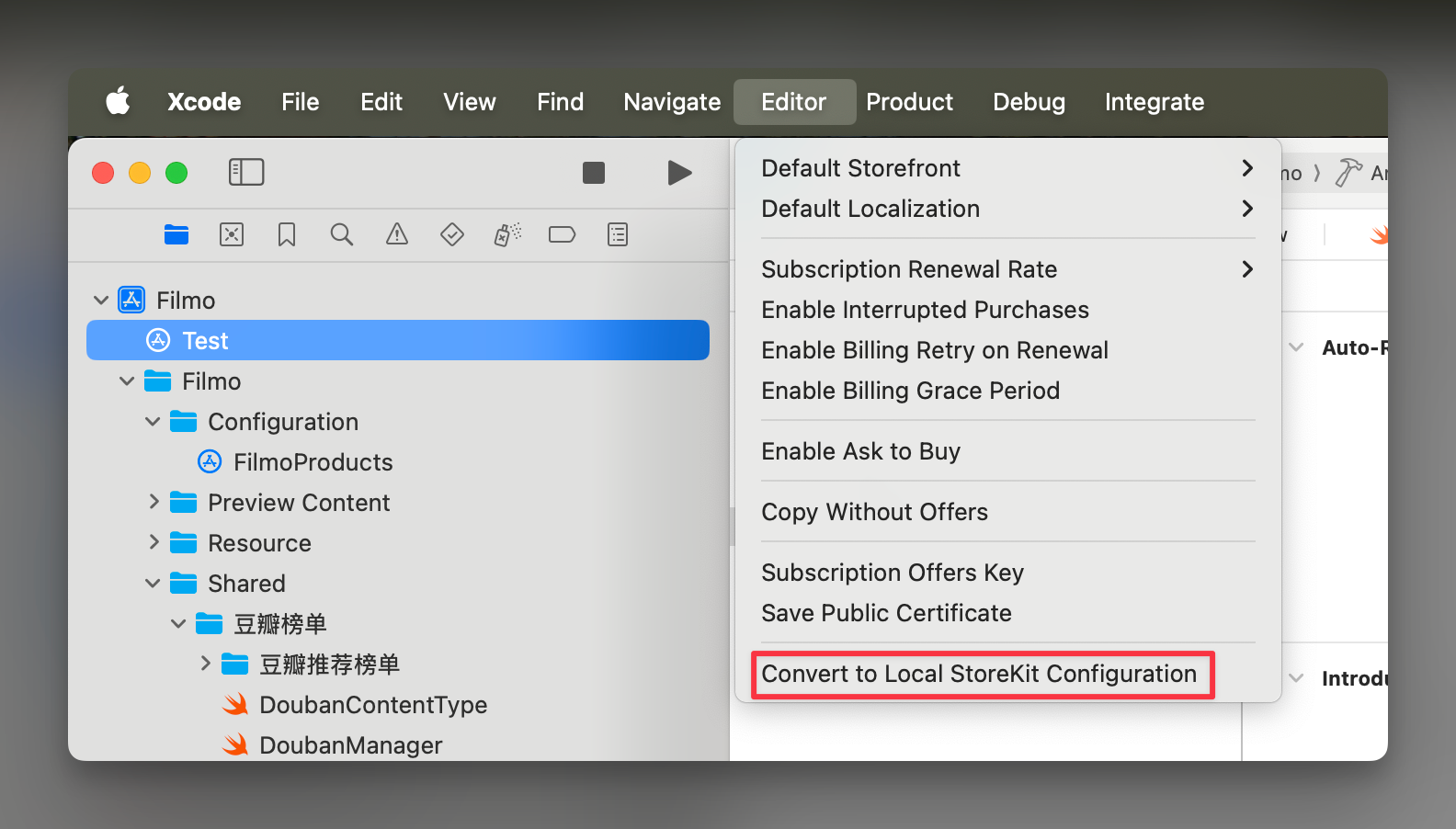 同步下来的 StoreKit 配置文件为只读文件,不可编辑。如果有必要,可以通过 Editor -> Convert to Local StoreKit Configuration 转换成本地可编辑文件。