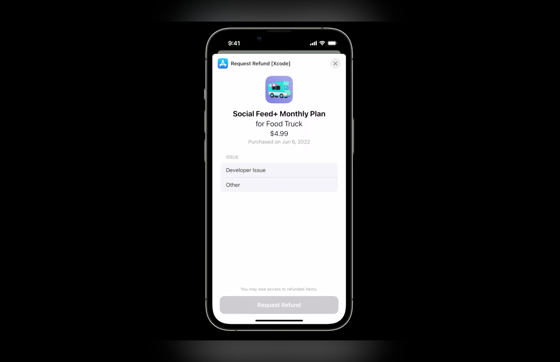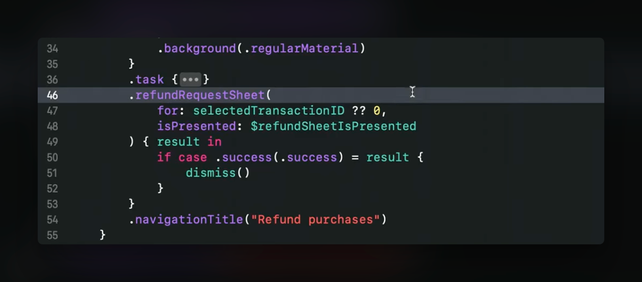 SwiftUI 提供了一个 .refundRequestSheet() 修饰器,可以在 App 内直接弹出申请退款的窗口。