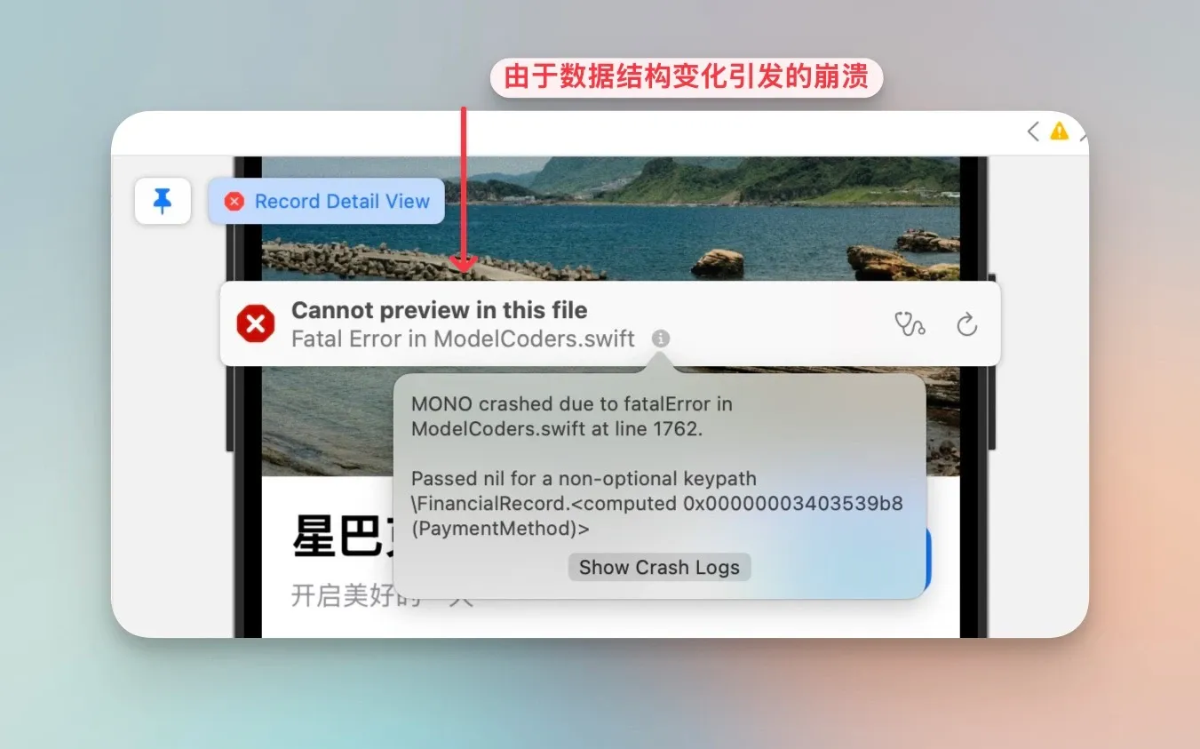 @Attribute() var paymentMethod: PaymentMethod = PaymentMethod.others // 新增字段,默认值为其他这一修改在新设备上运行良好,但是对于之前已经安装并使用过该应用的用户,却会遇到以下报错:crashed due to fatalError in ModelCoders.swift at line xxxx.