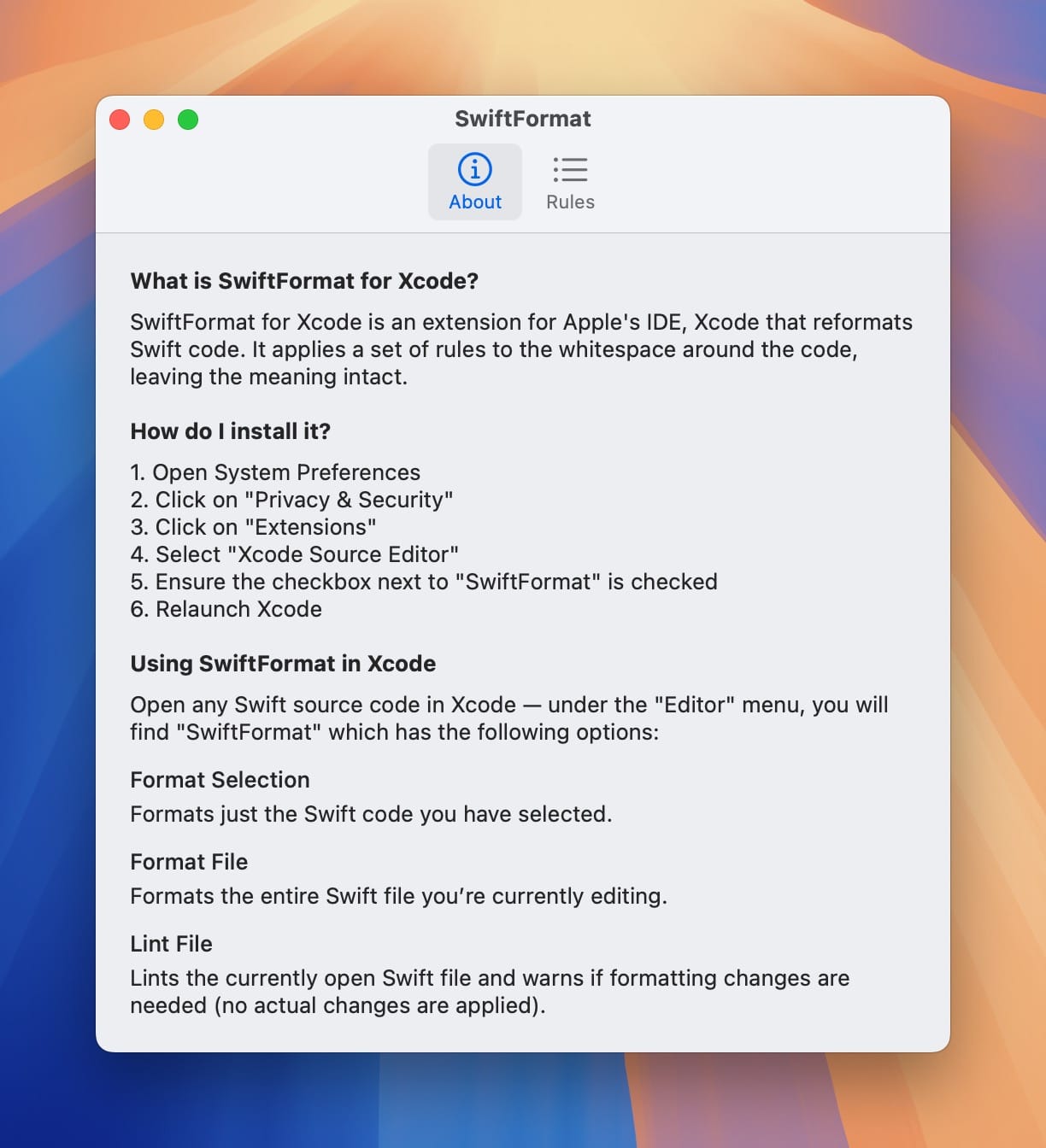 SwiftFormat for Xcode 是 Xcode 的一个扩展,可重新格式化 Swift 代码。