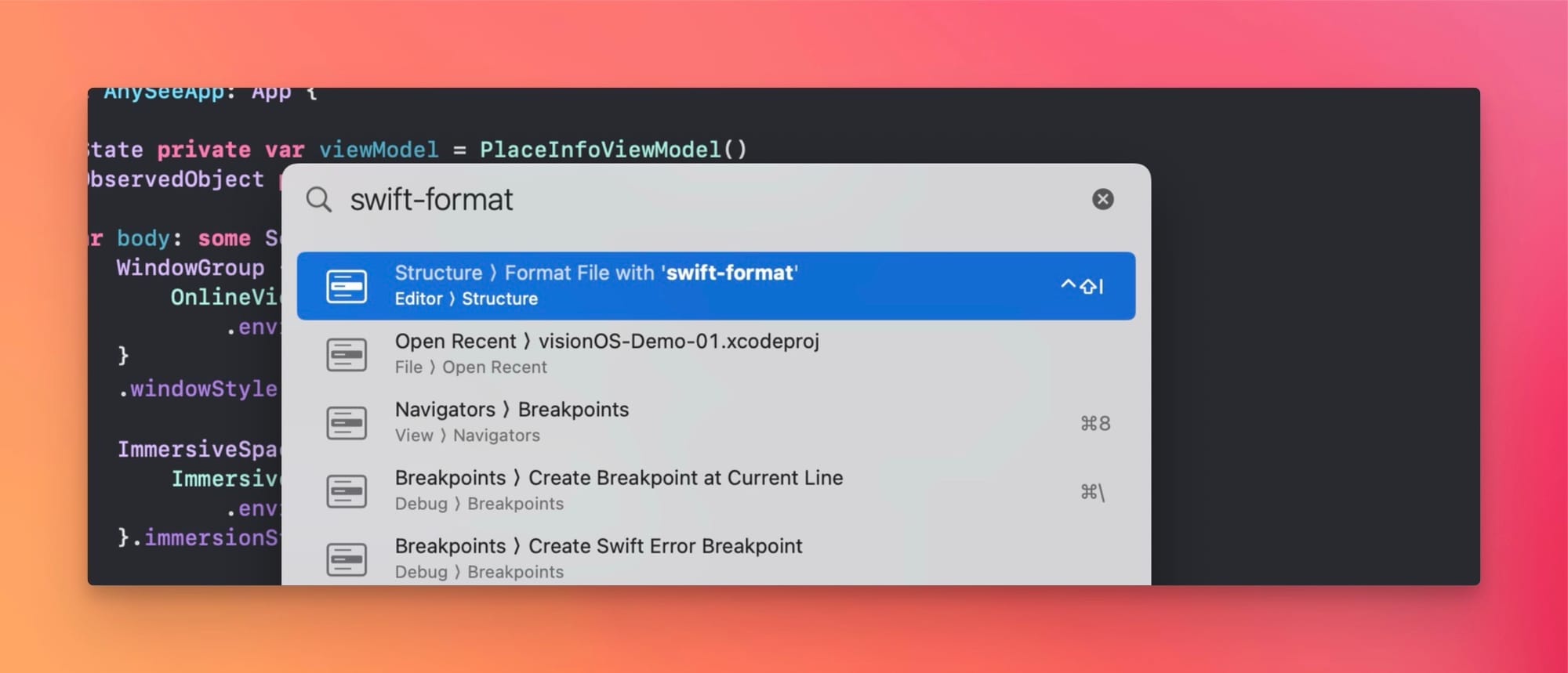 在 Xcode 16 的 Quick Action (Cmd + Shift + A) 中搜索 Swift-Format,可以看到 swift-format 相关提示: