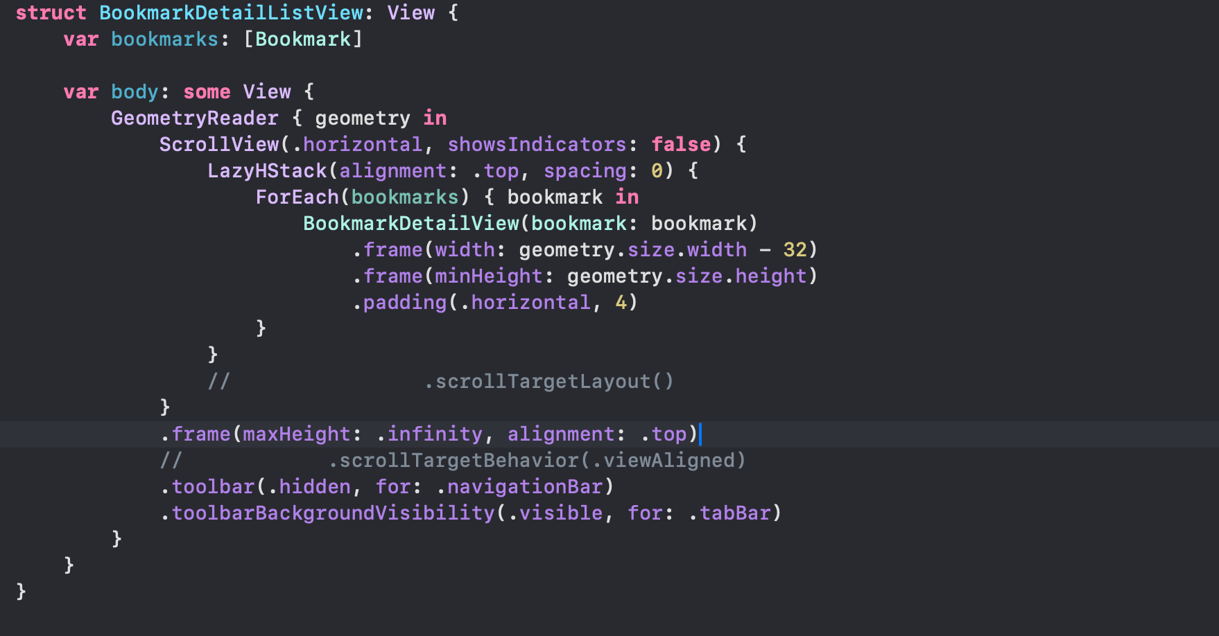 通过控制变量实验,发现是因为在 BookmarkDetailView() 组件中,使用 Text 组件加载了一个长文本: