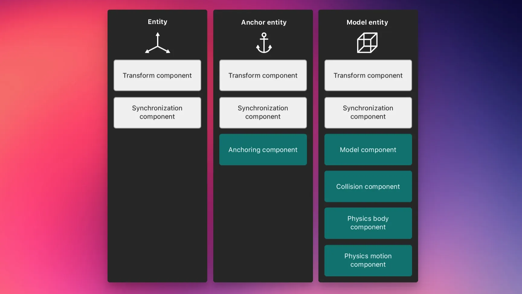 相反,AnchorEntity 通过与现实世界的特定物理特征(如平面、图像标记等)相关联,为其他 Entity 提供了一个稳定的基准。这意味着 AnchorEntity 通常是场景中位置固定的实体,而其他非锚定的 Entity 可以更自由地在虚拟环境中移动或变化。