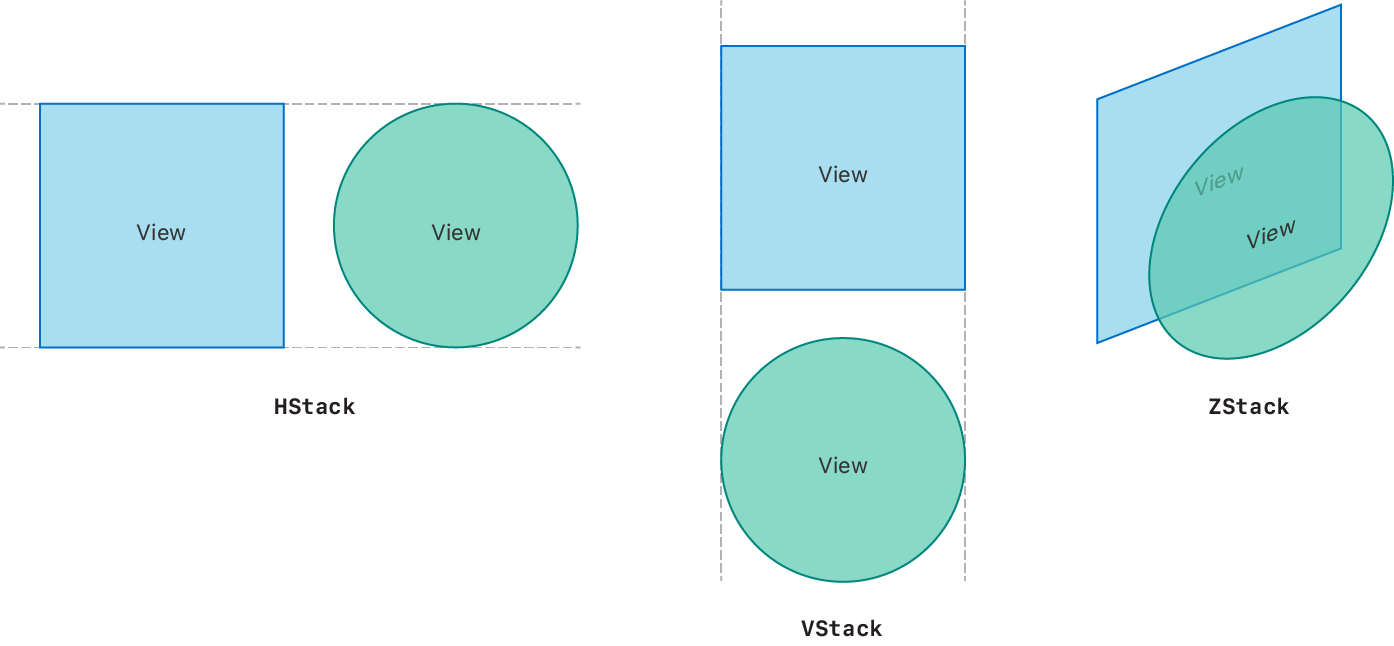 VStack(垂直堆栈)则是将子视图排列在一条垂直线上,子视图按照声明的顺序从上到下排列。